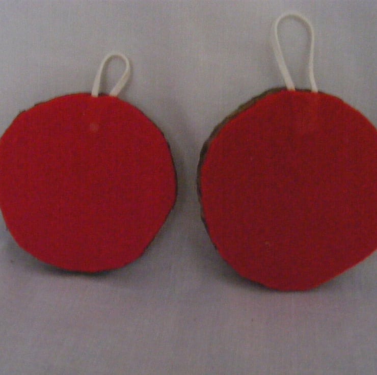 These lovely Christmas decorations are handmade using, log slices, napkins, varnish, felt and ribbon for hanging.