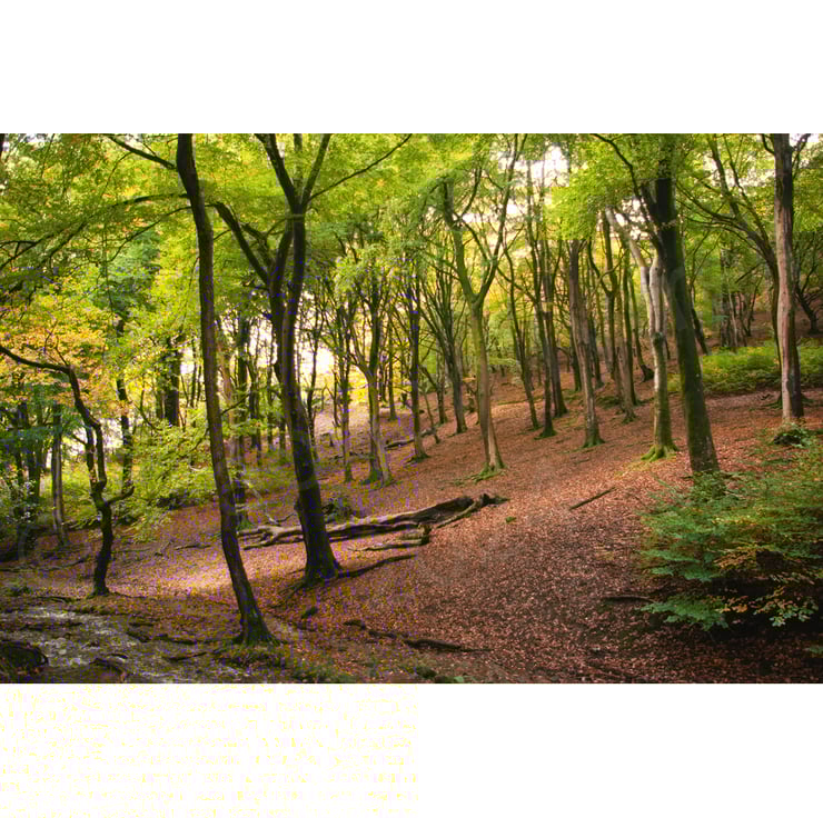 An A6 greetings card of a beech wood in the Bannau Brycheiniog during golden hour in early autumn. This is the beautiful St. Mary's Vale below the famous Sugar Loaf, with Nant Iago babbling by in the foreground. From an original image captured ona DSLR and reproduced digitally.