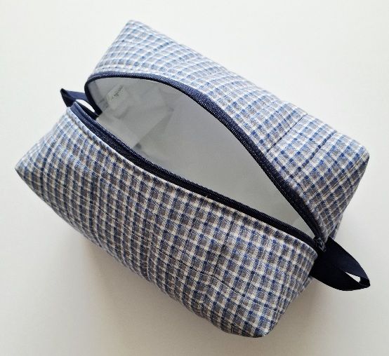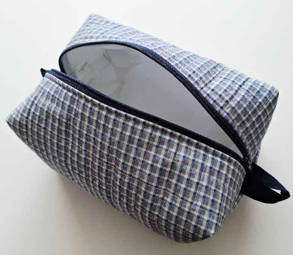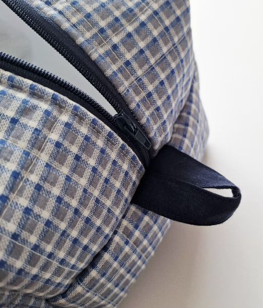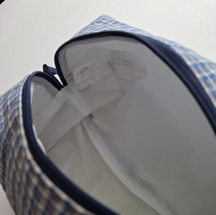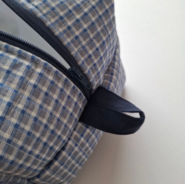 It was made using a lovely light blue checked cotton fabric and quilted. The pouch has a white waterproof lining. It features a navy blue zip and grab handles on both sides. It is lined with interfacing and fleece to give it structure, strength and a padded feel so that it will stand when empty.