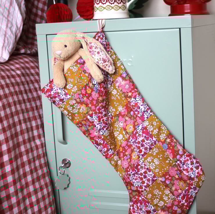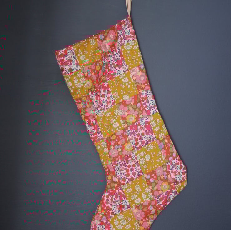 A vintage style patchwork Christmas stocking stitched from little scraps of Liberty fabrics in shades of gold, pink and green.