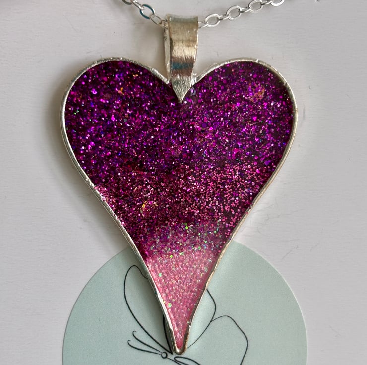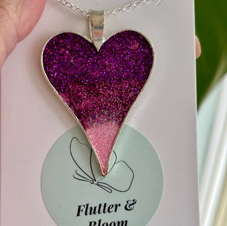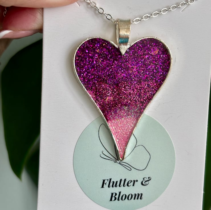 A heart full of twilight, this handmade pendant necklace glows with a gradient of deep purple fading into soft pink, scattered with flecks of glitter like stars in a dusky sky. Encased in a silver-toned frame and suspended from a delicate chain, it’s a piece that catches the light—and the imagination.