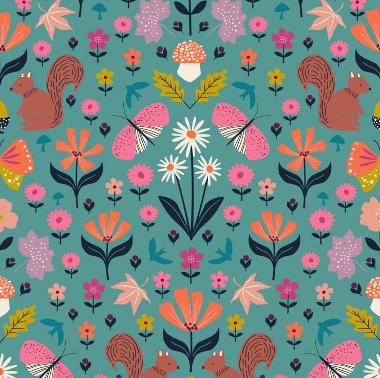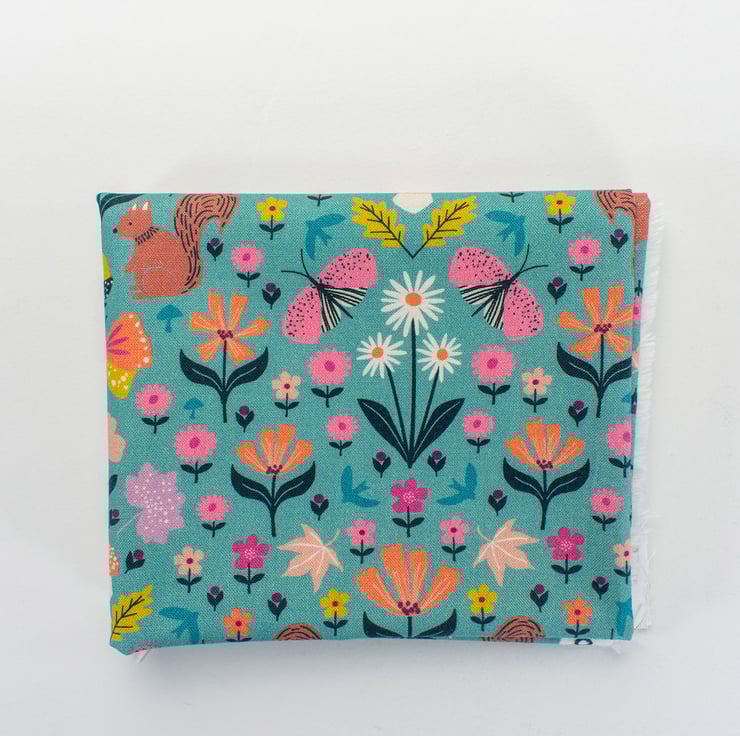 Escape into an Autumnal Woodland with these charming prints featuring pretty tree's in a rich, earthy palette perfect for all autumn sewing projects, this turquoise base with squirrels and bright palette of flowers & butterflies for this woodland wander design.