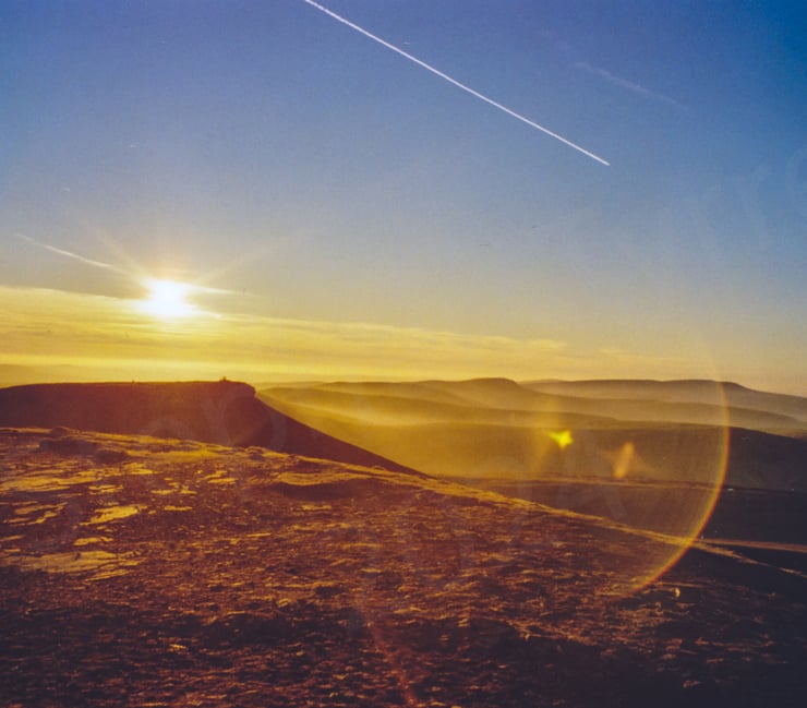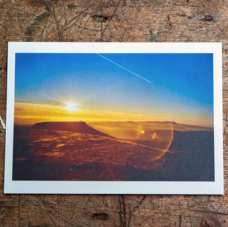 An A6 greetings card of the view from Pen-y-Fan, highest mountain in the Bannau Brycheiniog/Brecon Beacons as the sun begins to set. A classic mountain landscape scene at dusk.From an original image captured on 35mm film and reproduced digitally.