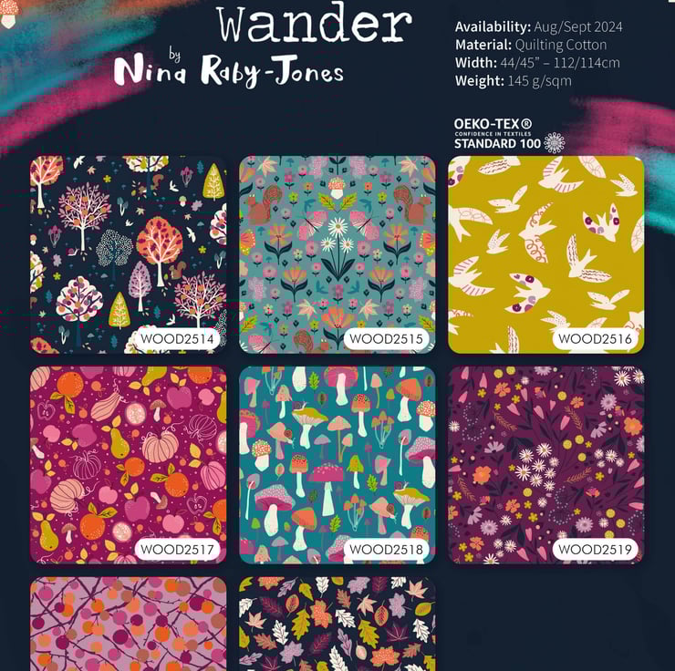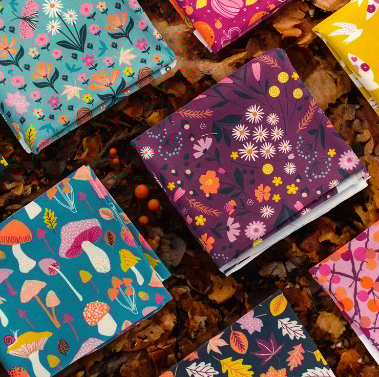 Escape into an Autumnal Woodland with these charming prints featuring pretty tree's in a rich, earthy palette perfect for all autumn sewing projects, with autumn berry colouring together with different woodland flowers this print would charm any sewing project