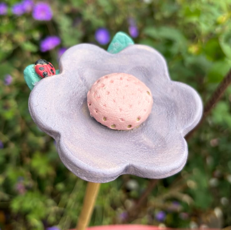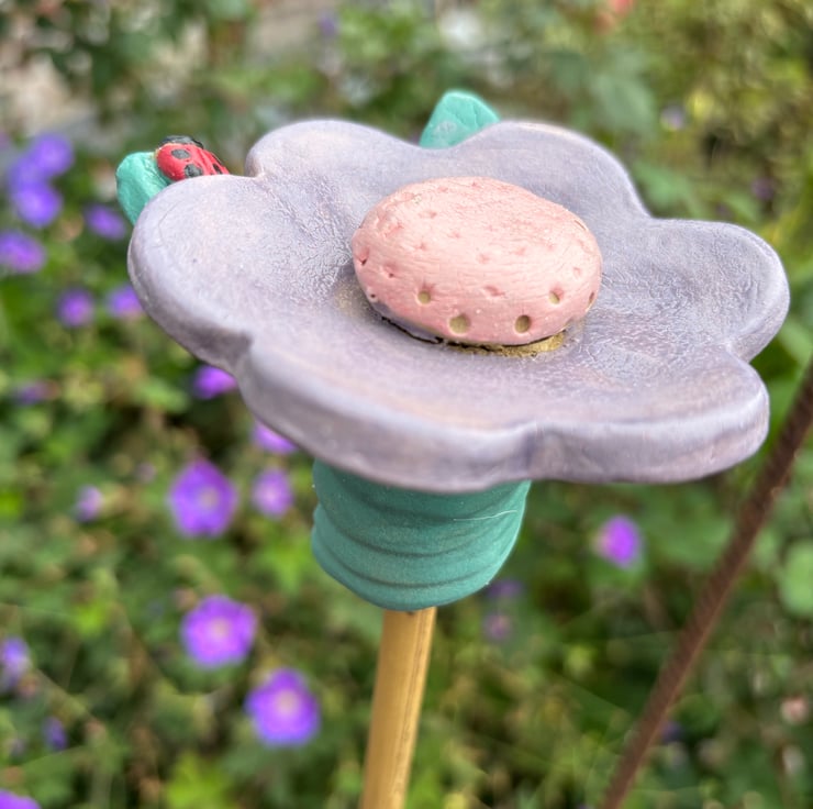 Bright and colourful flowery cane topper complete with ladybird to sit on top of your garden cane, preventing nasty accidents and brightening up your border all year round. Hand made from high fired stoneware clay this is completely frost proof and can stay outside safely in all weathers.