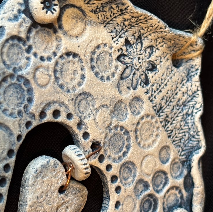 Impressed with lace, stamps, anything I can lay my hands on that will create a pattern in fact, then flooded with cobalt oxide and wiped back to highlight the textures. This decorative panel will hang on your wall indoors or outside on a wall or fence. Hand made from stoneware clay it is frostproof so can live outside in all weathers.