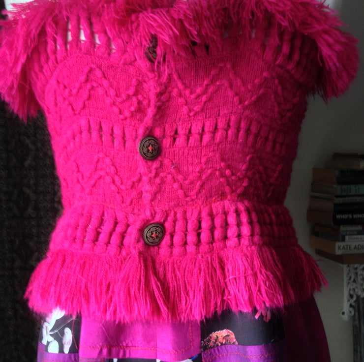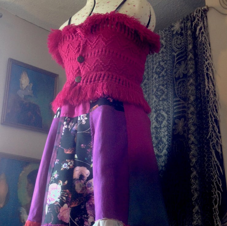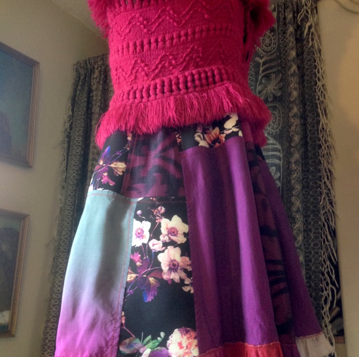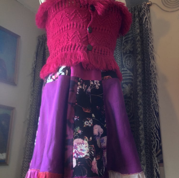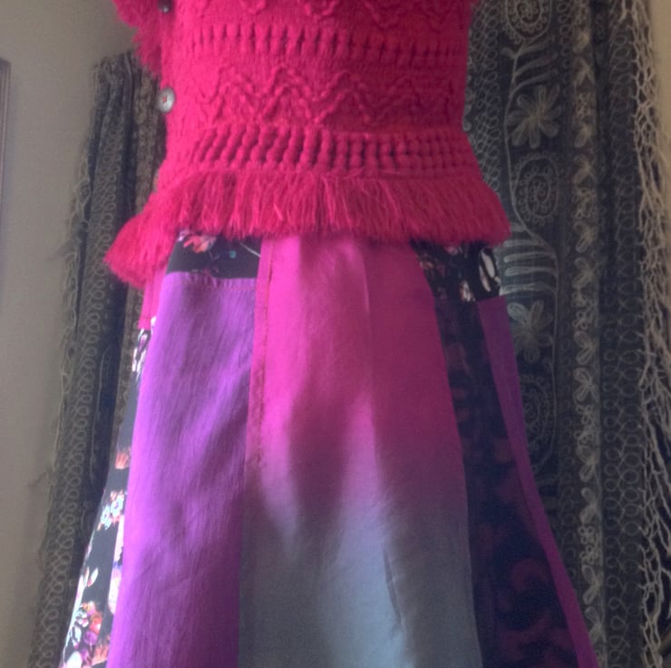 A quirky dance/evening dress with woolly Cerise pink bodice from fringed acrylic scarf, and patchwork semi-flared skirt, in rich colours: roses print on polyester, purple printed taffeta, pink/purple two toned silk. Hem frill. Narrow fabric straps and 3 wooden front buttons.