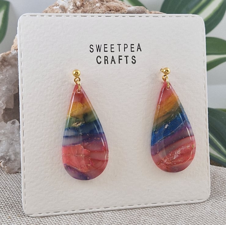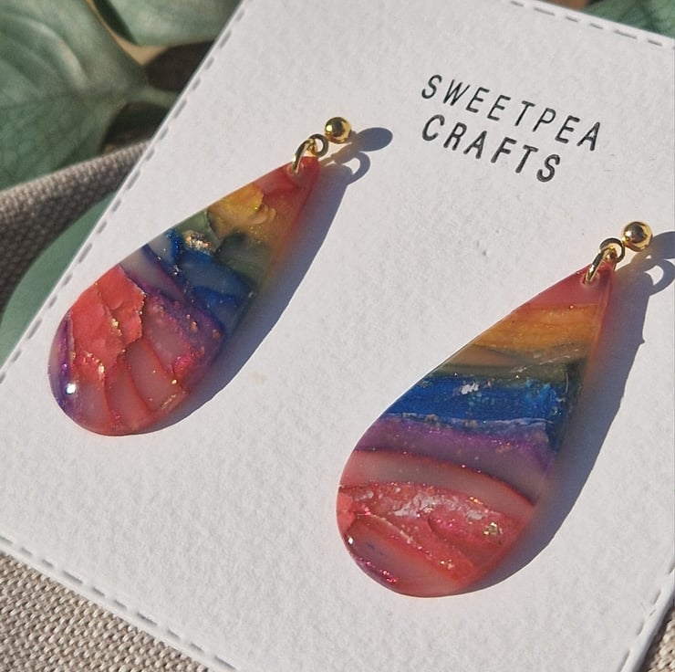 Handmade with care, these teardrop earrings are crafted from lightweight polymer clay, making them comfortable enough to wear all day. Each pair is unique, no two are exactly the same, giving you a truly one-of-a-kind accessory. Approximately 45mm long.