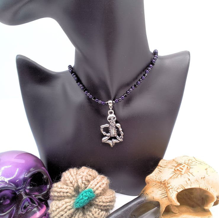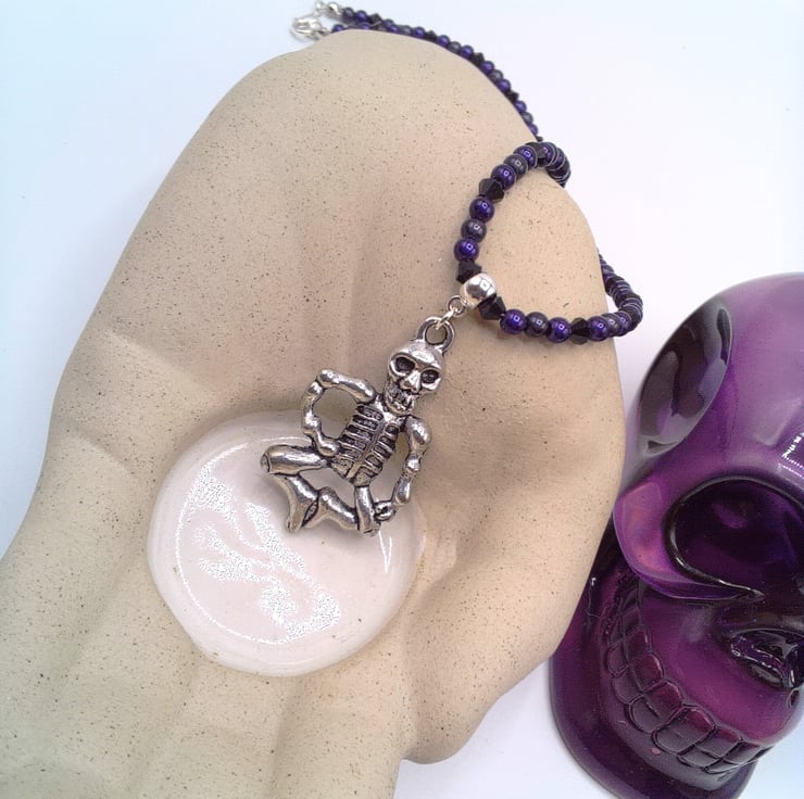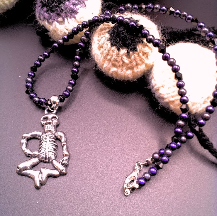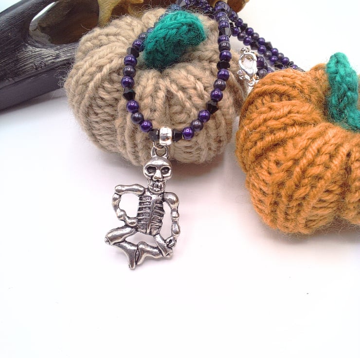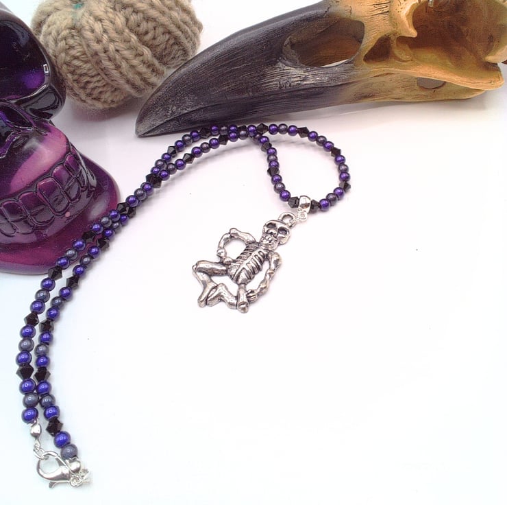 Dancing Skeleton Pendant on a Black and Purple Necklace, Halloween Jewellery, Halloween Jewellery, Halloween Accessories, Skeleton Pendant, Novelty Halloween Necklace, Purple and Black Necklace