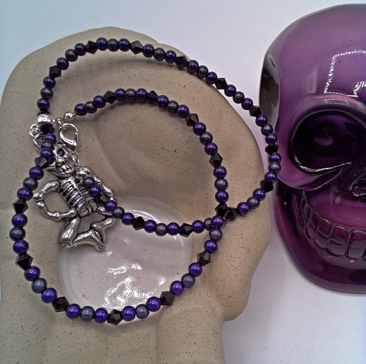 This fun and chunky pendant necklace is a great novelty Halloween gift for relatives or friends or as a gift for yourself. It will complement any outfit that you choose for your Halloween party. The dancing skeleton charm is silver plated and measures 4 cm x 2.5 cm. It is suspended on a necklace made with 3 mm black and purple miracle beads and 3 mm black bicone beads. It measures 16 inch (40 cm) and is fastened by a silver plated lobster clasp. The necklace will be dispatched wrapped in tissue paper in an organza bag and delivered to you via Royal Mail 1st class post.