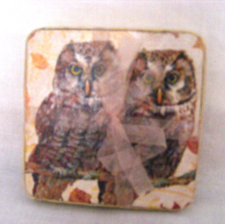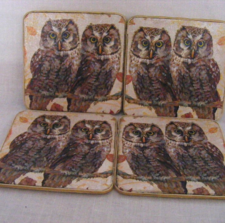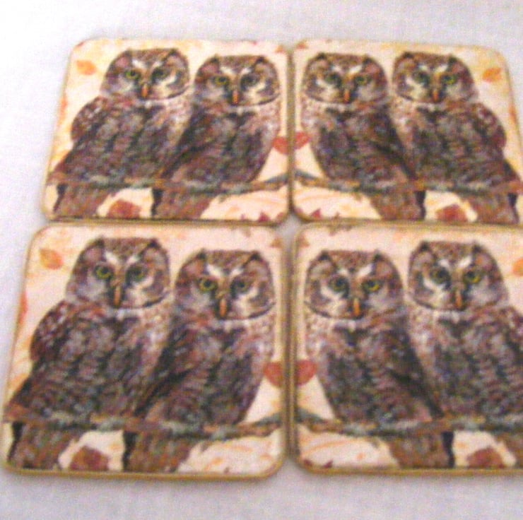 I've decoupaged this beautiful set of 4 coasters with owl napkins and then applied several coats of varnish. Back of coasters have cork on them and the sides have velvet ribbon on. This lovely set of 4 coasters arrives tied together with a organza ribbon.