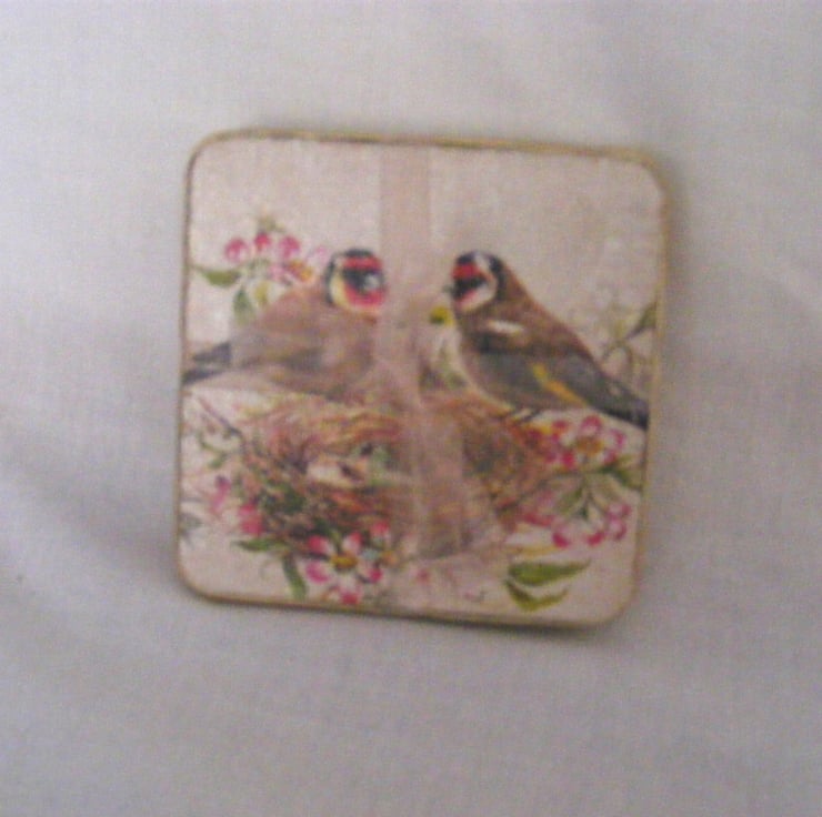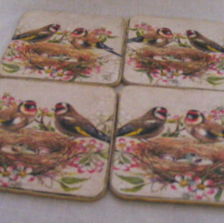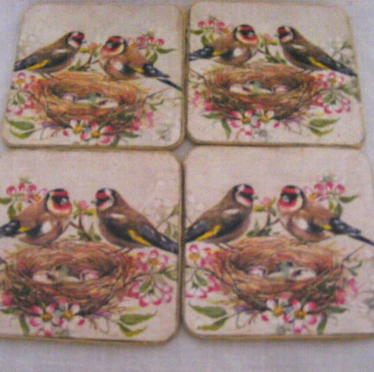 This lovely set of 4 handmade coasters would look great on any coffee table. I've decoupaged the coaster blanks with napkins and when dry added several coats of varnish. Coasters have a cork backing and velvet ribbon on the sides. Please don't immerse coasters in water. Wipe clean with a damp cloth.