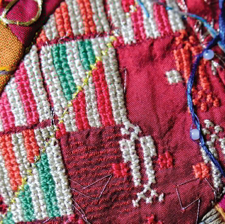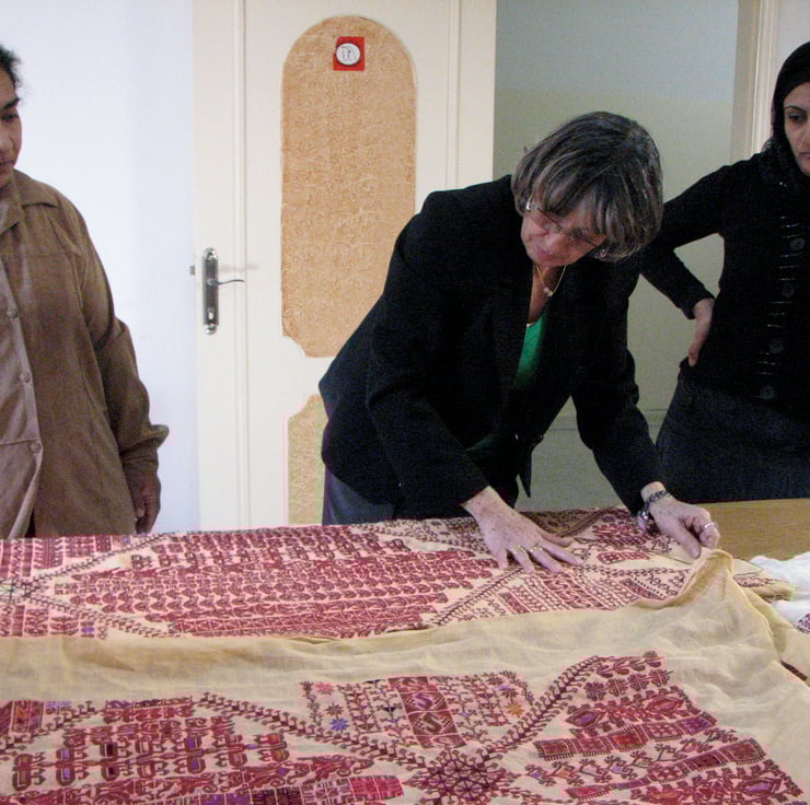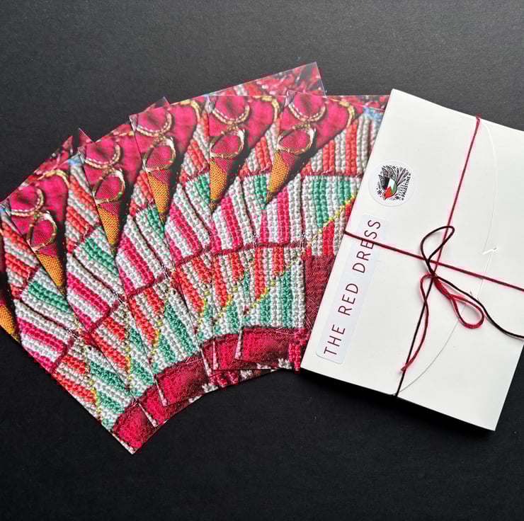 A selection of 6 high quality postcards displaying a detail from the commissioned embroidery on The Red Dress by Lina Abd Allah and Rasmieh Ali Abu Salem, 2 refugee women from Palestine supported by Al-Badia in Lebanon, a Najdeh Association program and commercial outlet enabling Palestinian refugees to earn a small income by stitching traditional TATREEZ embroidery.