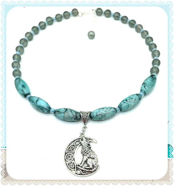 Using this Tibetan silver Wicca howling wolf pendant I’ve added these large oval glass beads with frosted glass & seed beads & a Tibetan silver connector onto stainless steel memory wire.