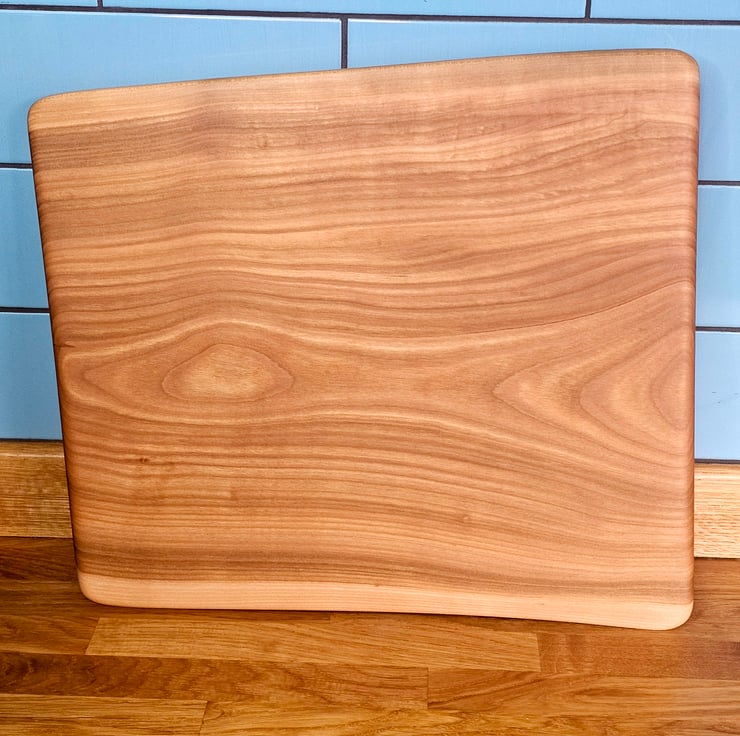Crafted for the culinary enthusiast, this medium-sized Live Edge Cherry Cutting/Chopping Board brings a touch of rustic elegance to your kitchen. Made from high-quality wood, it features a unique medium brown wood tone that not only adds a natural aesthetic to your prep area but also ensures durability and longevity. The board's rectangular shape, measuring 40cm in length and 33-37cm in width, provides ample space for chopping and serving. Each board is meticulously handmade, highlighting the natural beauty of the wood grain. Finished with three coats of food safe mineral oil and one coat of mineral oil/beeswax Board Balm. The board also comes with a free tin of 30ml Board Balm, a moisturising cream that nourishes the wood. Our boards also come fitted with rubber feet to ensure stability in use.