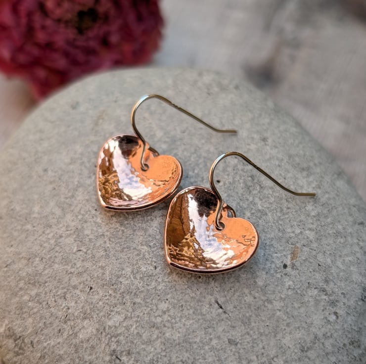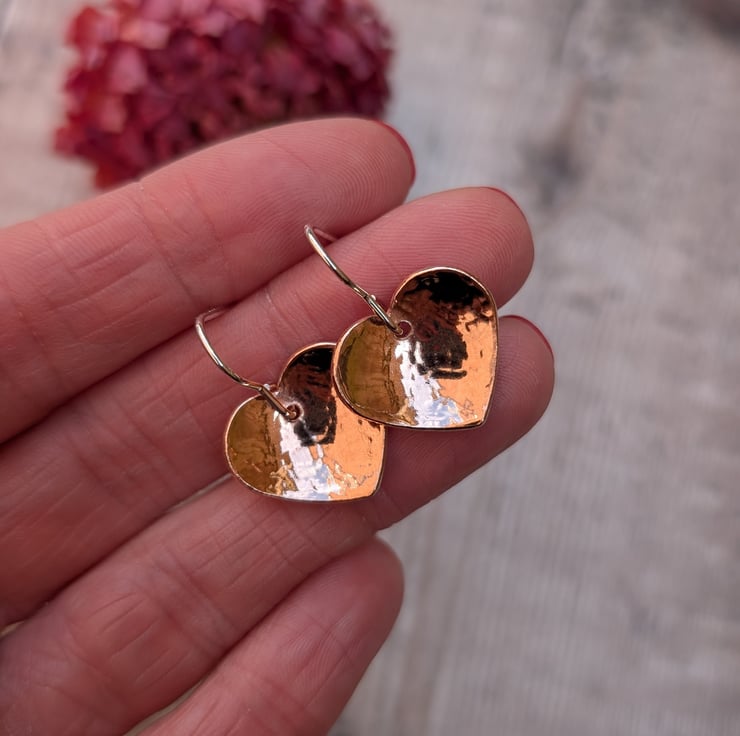 Gorgeous copper hammered heart earrings, hand made from Copper and recycled Sterling Silver using traditional silversmith techniques and given a shiny polished finish.