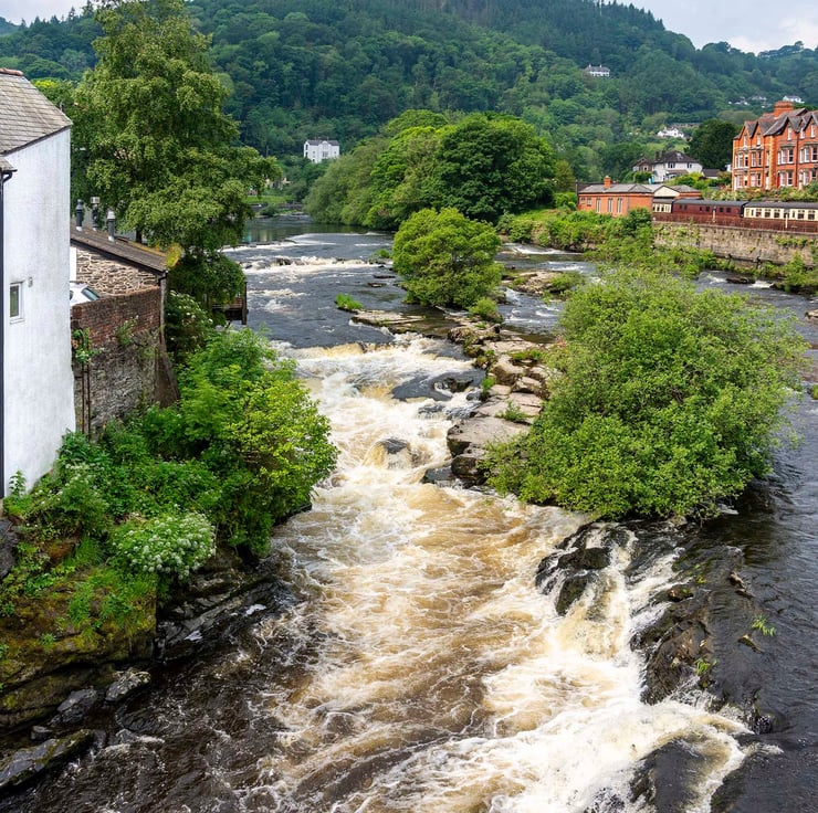 Whitewater challenge. In the pretty town of Llangollen in Wales the river Dee makes a dramatic series of white water rapids that several adventure companies make use of to provide raft or even tubing experiences for the brave.