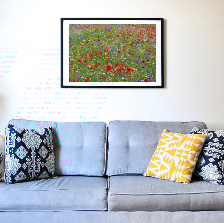 A true riot of colour guaranteed to brighten any room. A beautiful, tangled, brightly coloured array of wild flowers in a meadow.