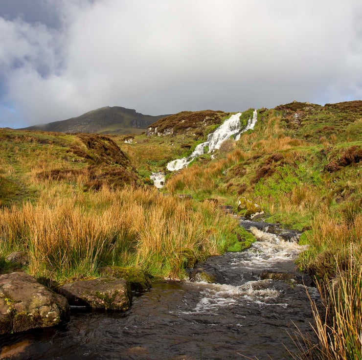 Brides veil falls is on the Isle of Skye, Scotland and just a short, walkable distance from the more famous Old Man of Storr you can find Brides Veil Falls. Scotland has a very changeable climate with blue skies and sunshine one moment only to be followed by mist or serious rain the next.