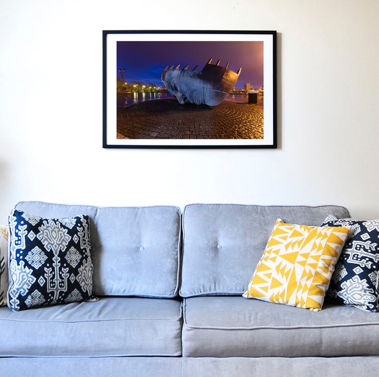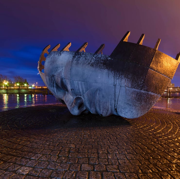 I have 2 versions of this image available so you can take your pick. This is the Merchant Seafarer's War Memorial situated at Britannia Quay, Cardiff Bay, Wales. The artist is Brian Fell and it is in memory of the merchant seafarers from the ports of Barry Penarth and Cardiff who died in time of war. Commissioned in 1994 by the Cardiff Bay Arts Trust it comprises a melding together of a man's face and the damaged hull of a ship.