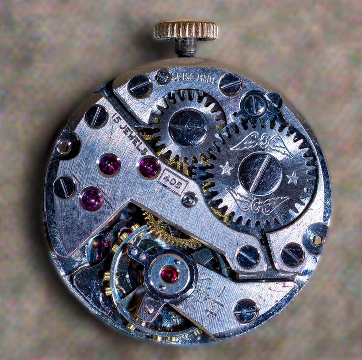 A macro image of the inner workings of a ladies wrist watch. In real life this is appx 2cm across and is a masterpiece of engineering precision. The jewels really are jewels.