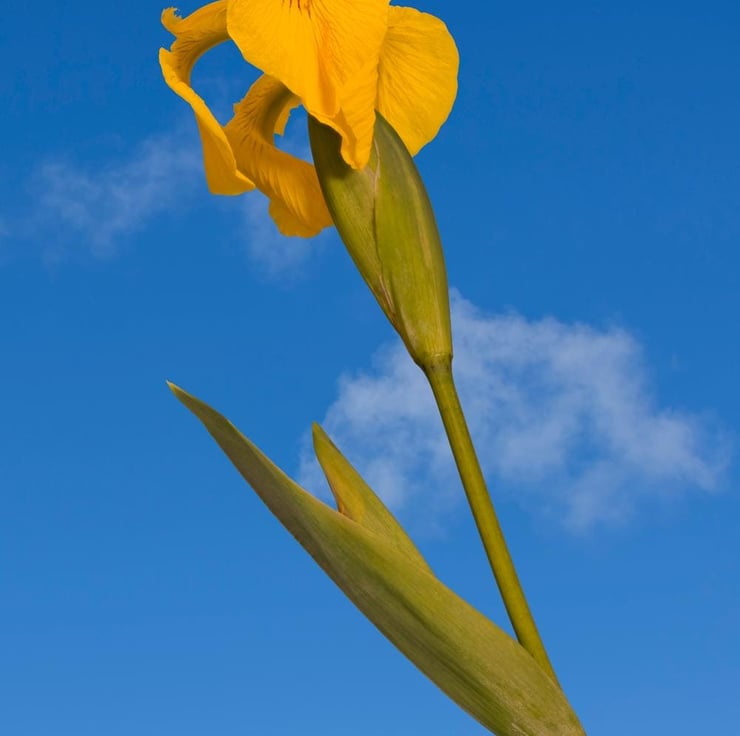 Isn't nature truly amazing? A beautiful bright yellow flag iris, Iris pseudacorus flower against blue sky and clouds. Simple colours that work so well together.