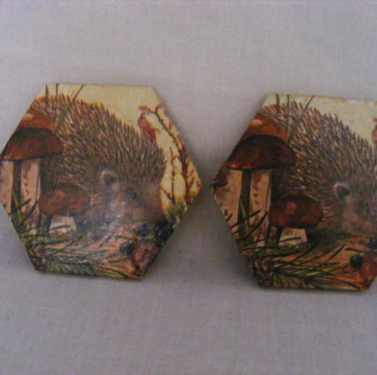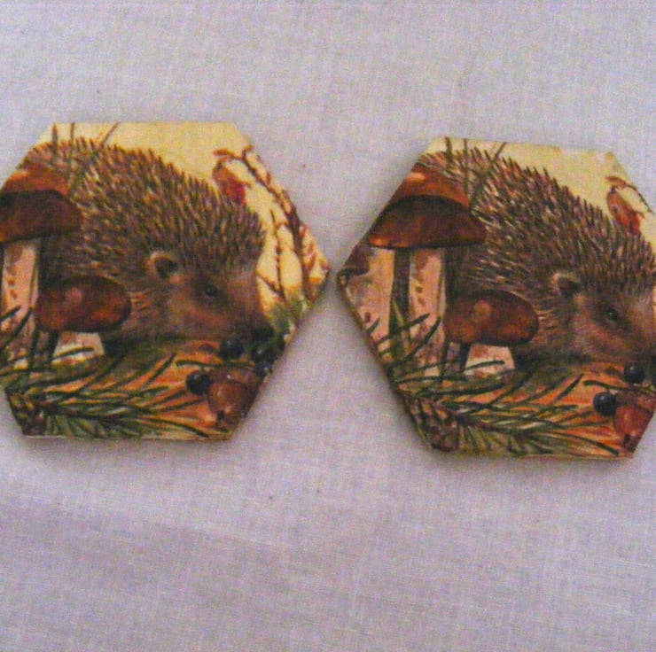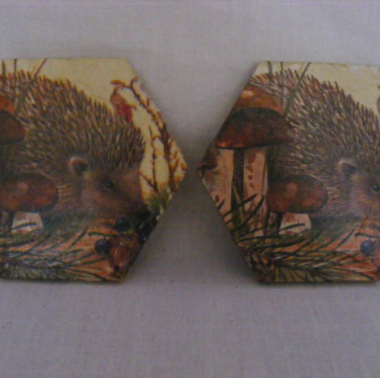 Two lovely handmade decoupaged hedgehog coasters for your coffee table. Perfect gift for any wildlife lover. Wipe clean with a damp cloth only.