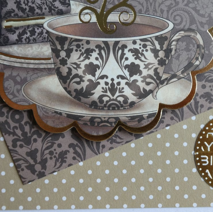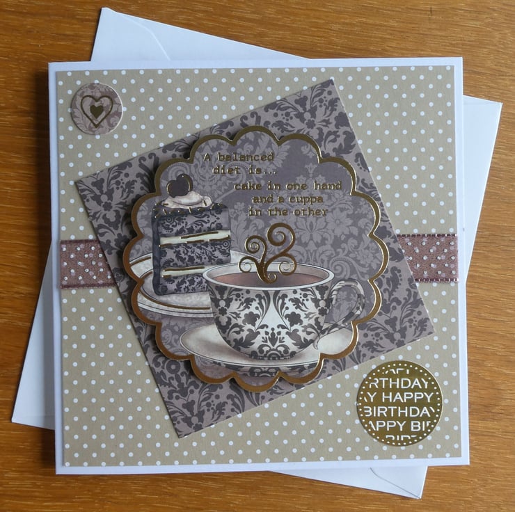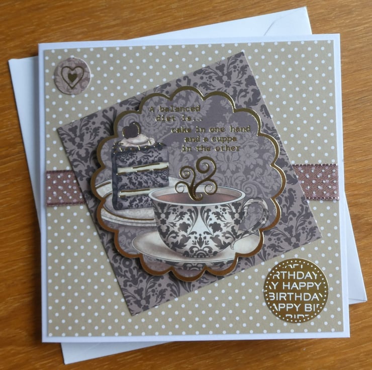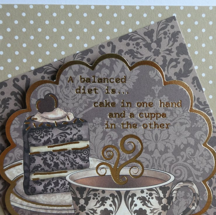 With the message 'A balanced diet is.. cake in one hand and a cuppa in the other', this birthday card in shades of coffee, chocolate brown and gold would be ideal to send to someone who loves a cup of tea and a slice of cake or two.
