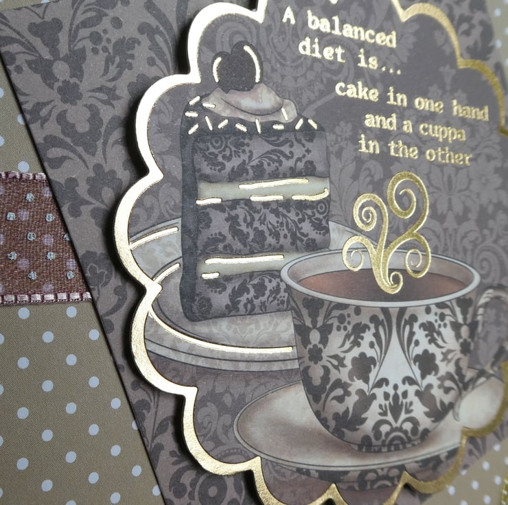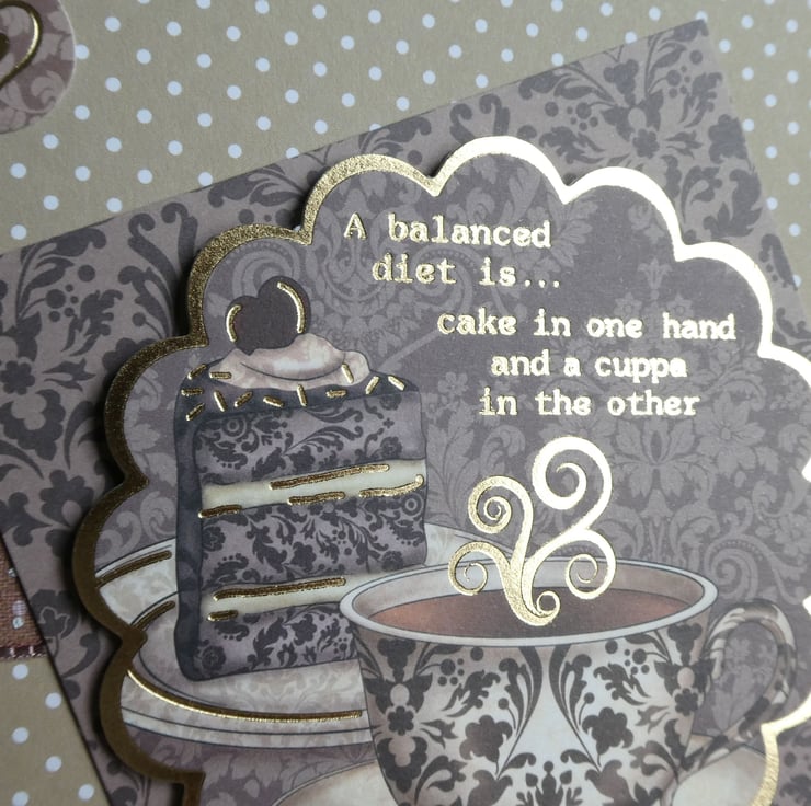 A central circular printed topper with a scalloped edge, showing a cup of tea and a slice of chocolate cake has the message 'A balanced diet is.. cake in one hand and a cuppa in the other'. The image has been mounted on foam pads above a band of polka dot chocolate brown organza ribbon and layers of patterned card, with a coffee and dark brown damask pattered layer offset onto a brown and white polka dot patterned background.