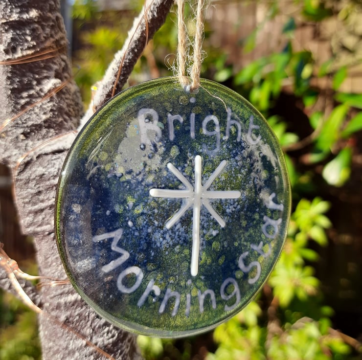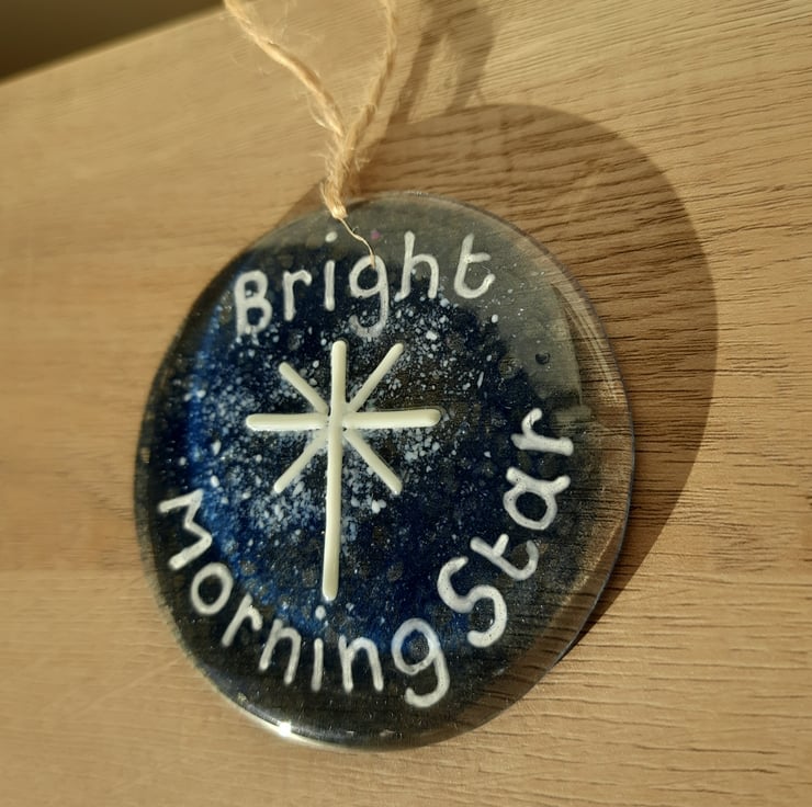 A fused glass hanging decoration celebrating one of the names of Jesus as the Bright Morning Star. It is made from two layers of glass coloured with blue glass powders and fused together. The white star and writing was then added on top and the piece fused again. Once made I drilled a hole in the glass to add the jute string to hang it with.