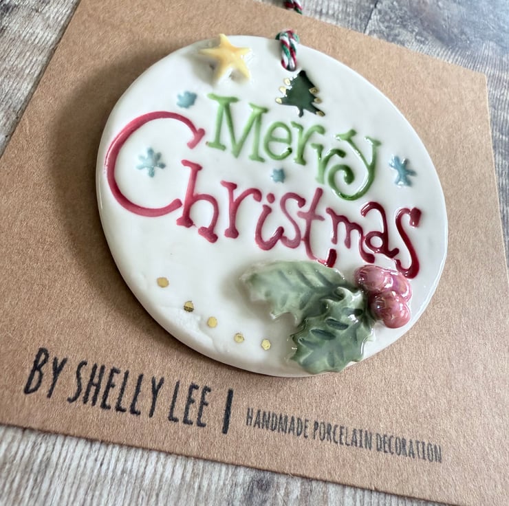 Merry Christmas hanging decoration finished with a mother of pearl and gold lustre