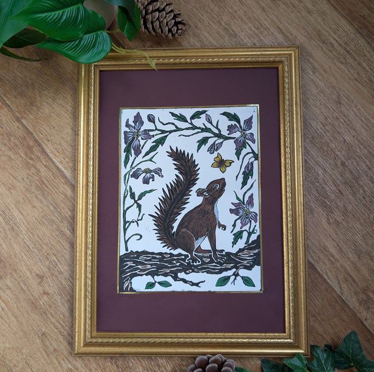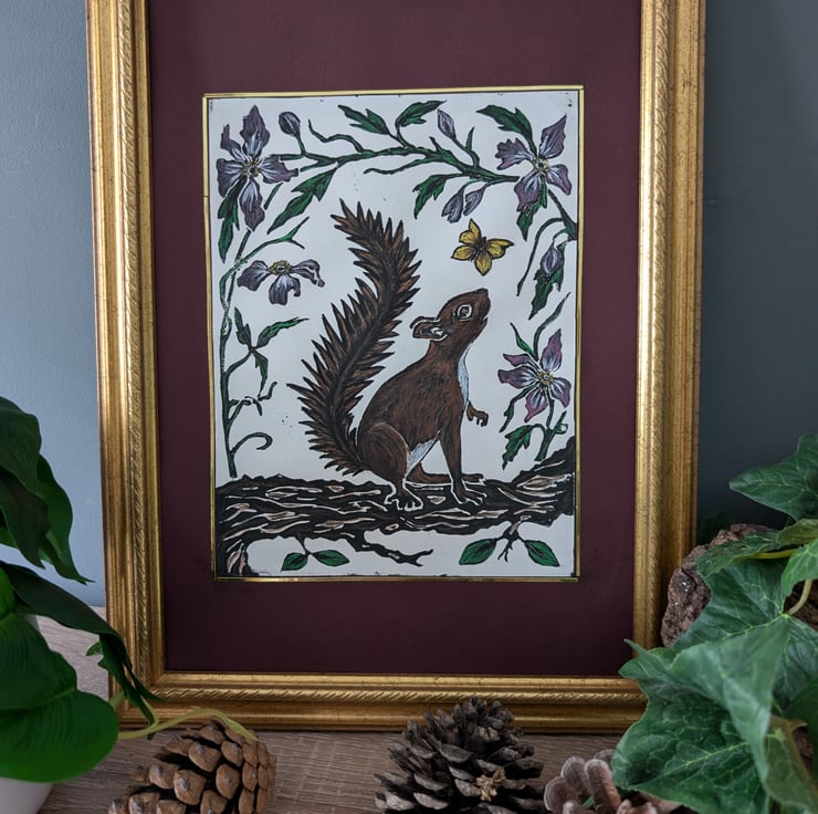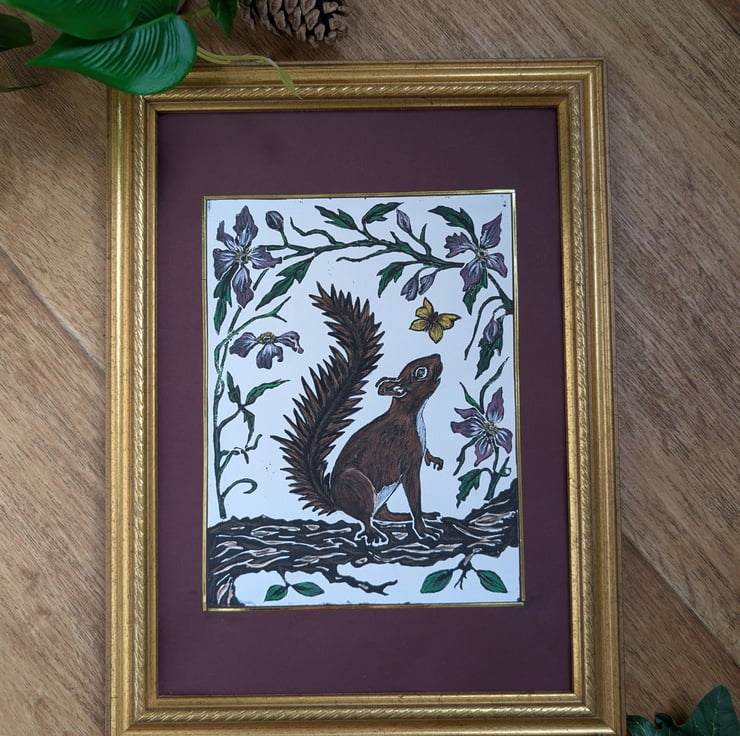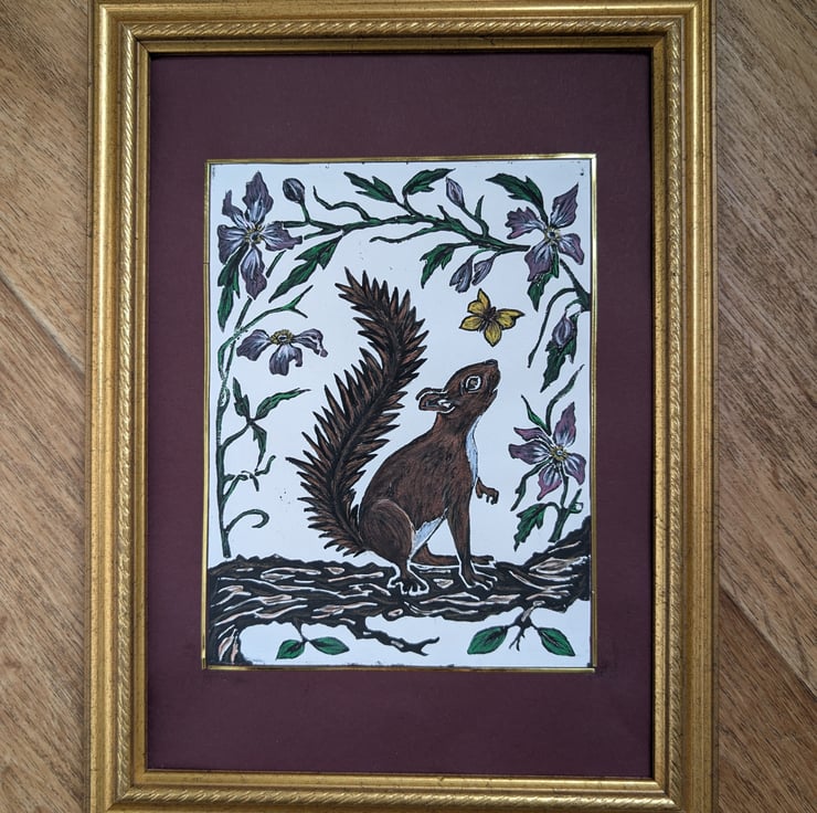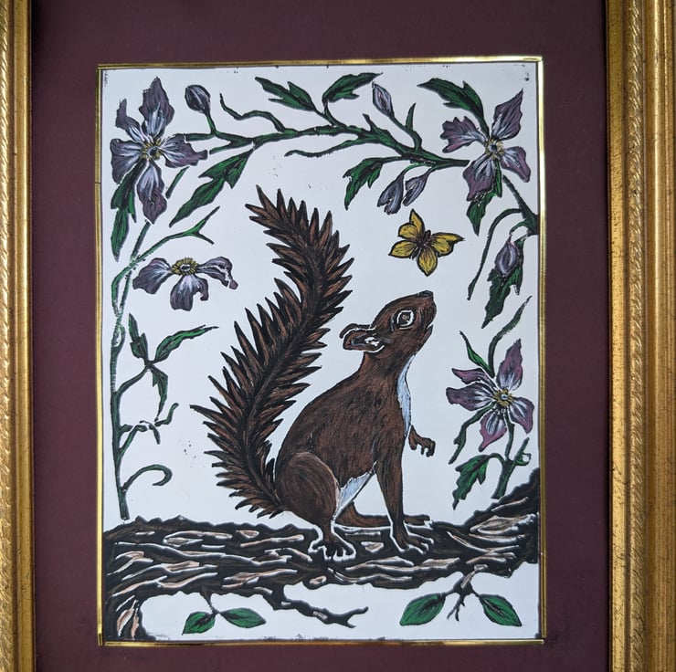 Then colour is added to the dried print, using acrylic paints, including metallic copper on the squirrel.