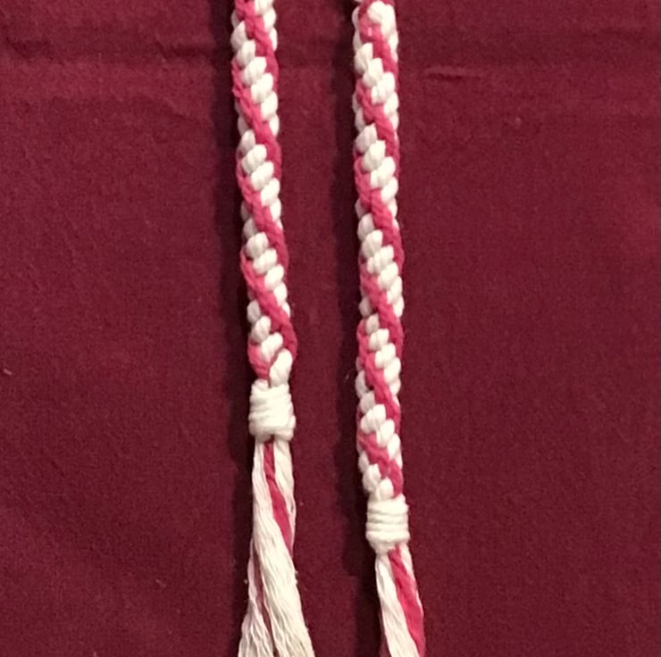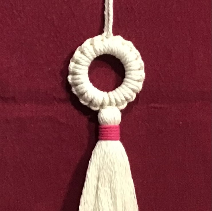 These are made of natural macrame cord trimmed with pink cord trim and wooden beads.