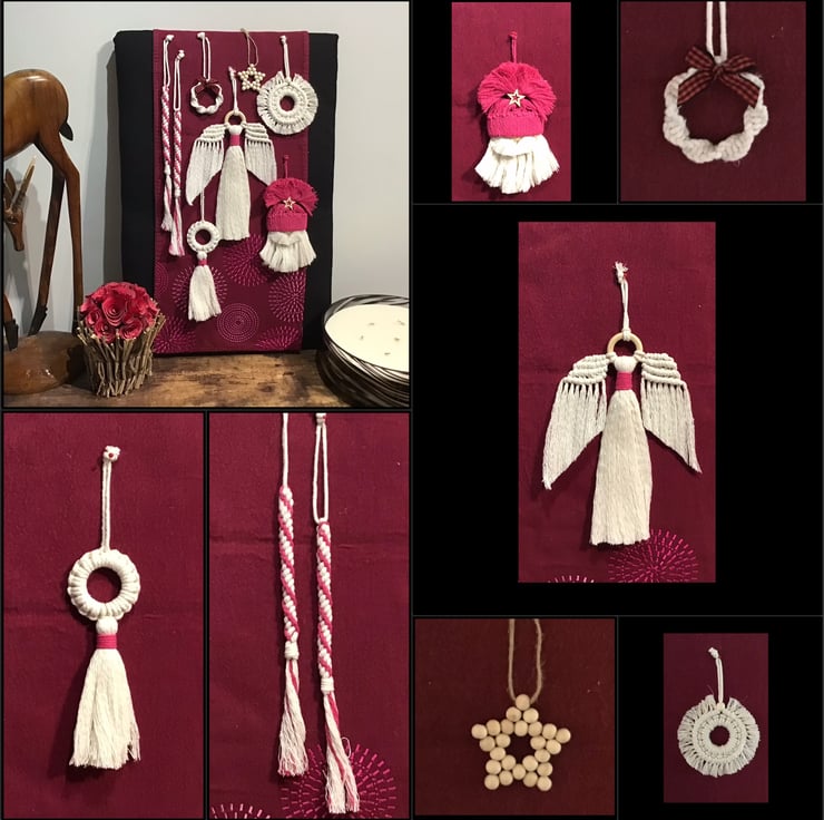 A selection of 8 macrame Christmas decorations with a Boho feel.