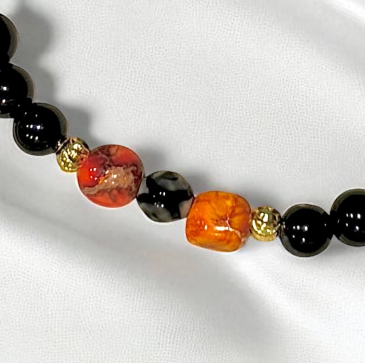 Update your accessory collection with this stunning handmade bracelet featuring a vibrant mix of orange sea sediment jasper, striking Dzi stone beads in an eye-catching Aztec style pattern, and sleek black Obsidian. The elasticated design ensures a comfortable fit for a 7” wrist, while the 3mm ribbed gold-filled spacer beads add a touch of elegance. Perfect for treating yourself or gifting to a loved one, this unique piece comes beautifully wrapped in tissue and an organza bag. Need a different size? Just send me an email, and I will be happy to customise it for you!
