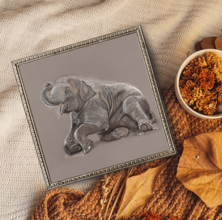 This is a beautiful and whimsical peice of art. I have tried to capture the sunlight and the full character of this playful and happy elephant.
