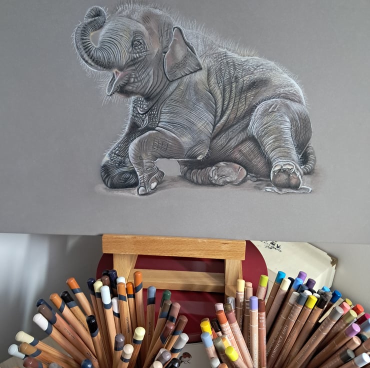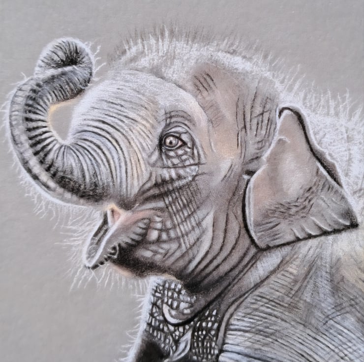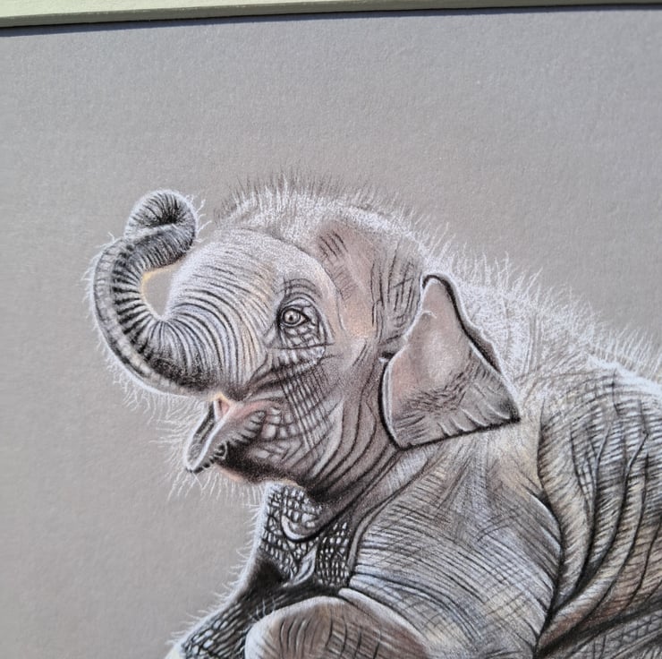 I really tried to capture the innocent baby elephant in this drawing and the glorious sunshine upon it.