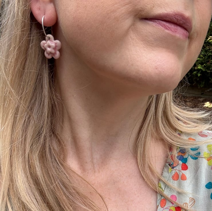 These handmade earrings combine the charm of hand-crafted porcelain with the elegance of sterling silver, making them a perfect statement piece for day to evening wear.