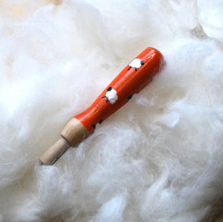 Hand painted, wooden needle grip holder for use with needle felting needles, orange with little white sheep. A perfect gift for your felting friends or as a treat for yourself.