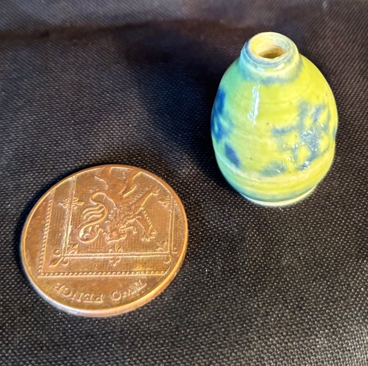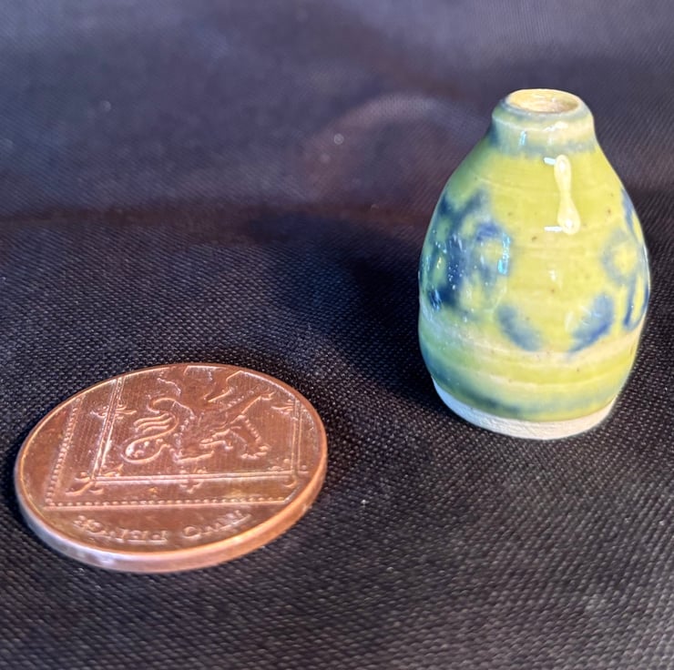 Teeny tiny vase made on my teeny tiny wheel and decorated with a cheerful yellow glaze and fine brushwork in cobalt blue. Approx 3-4cm h, perfect for the dolls house or miniature collection.