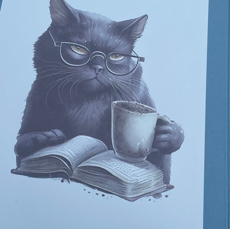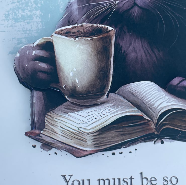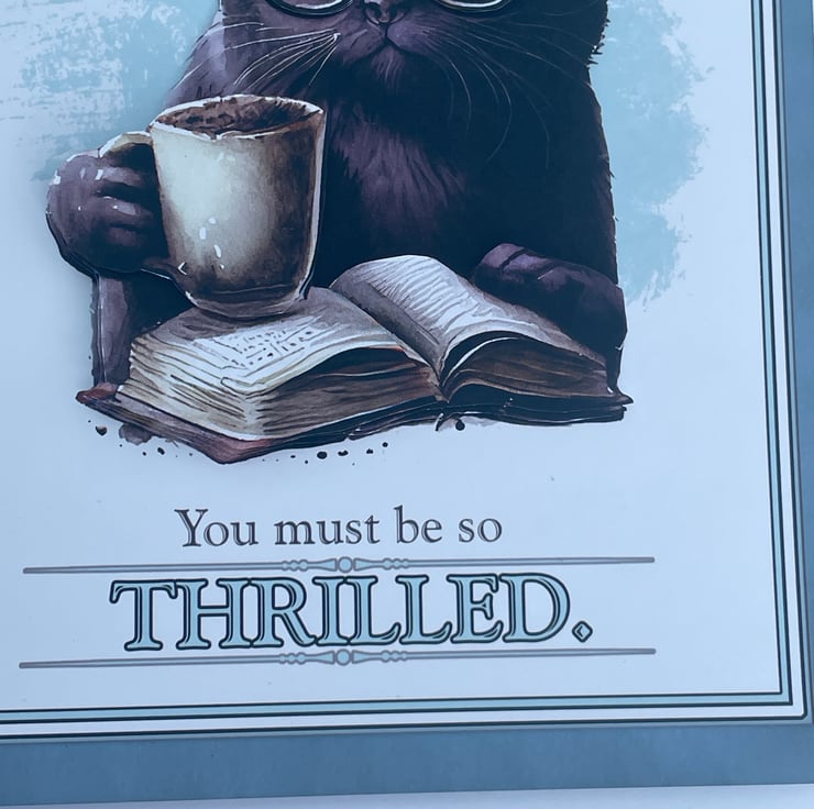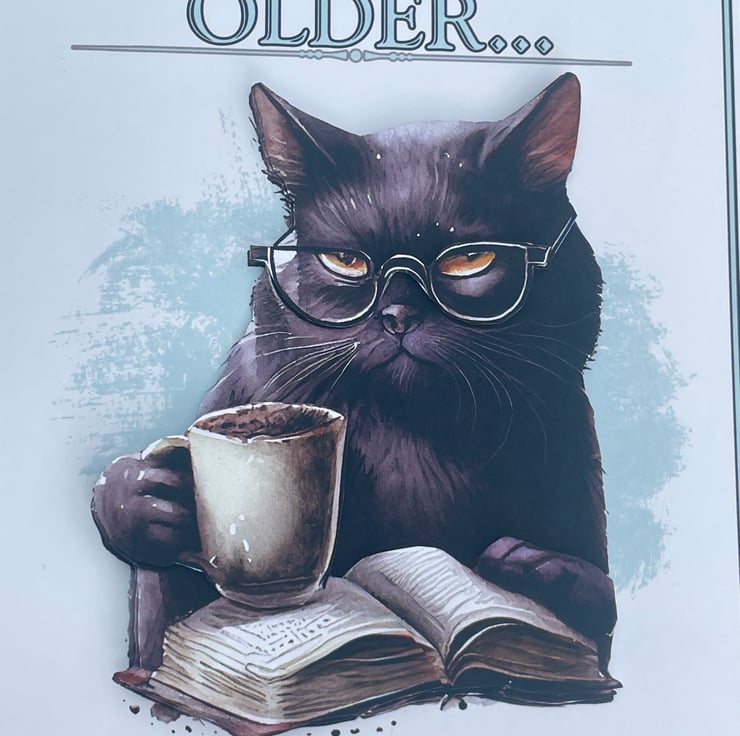 For the grumpy ager! This A5 sized card features what can only be described as a very grumpy cat! He or she is sitting with a cup in their hands, with a book and glasses. Their demeanour is definitely grumpy as I don't think they are enjoying the sentiment! This image is decoupaged (layered) to give it a three dimensional effect. The sentiment says Another year older...You must be so thrilled. The main card is a blue card. Inside the card has a matching image and the greeting Wishing you a purrrfect birthday. A fun and amusing card for a birthday.