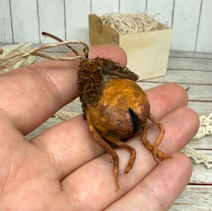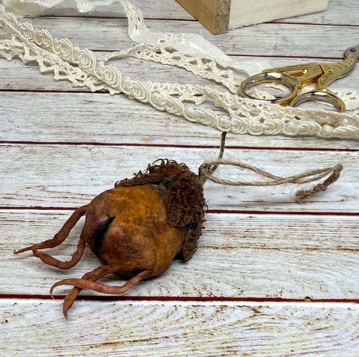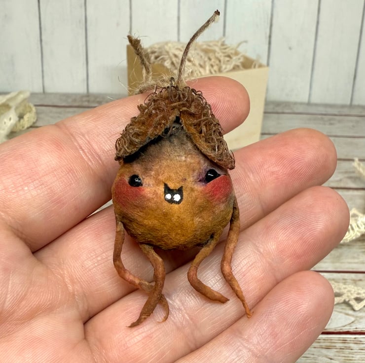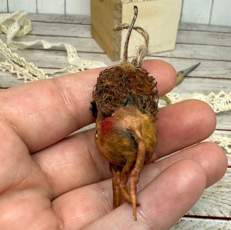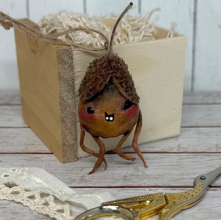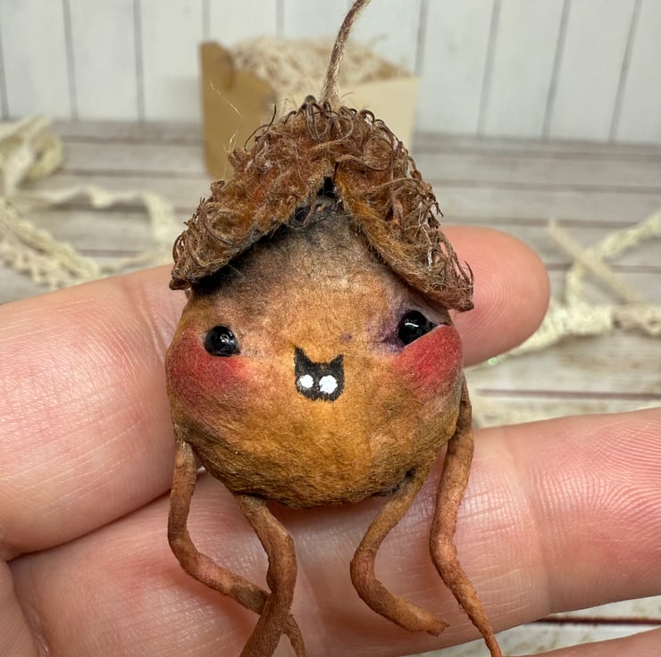 Spun Cotton character with dried beech nut hat. This little friend is hand painted with glass bead eyes and jute twine hanger. Friend measures roughly 7cm tall.