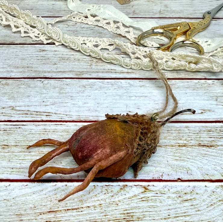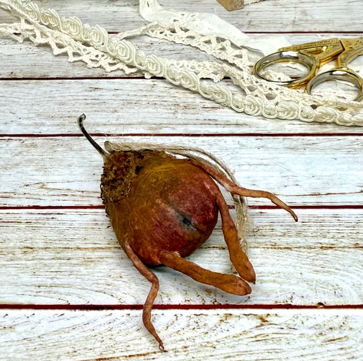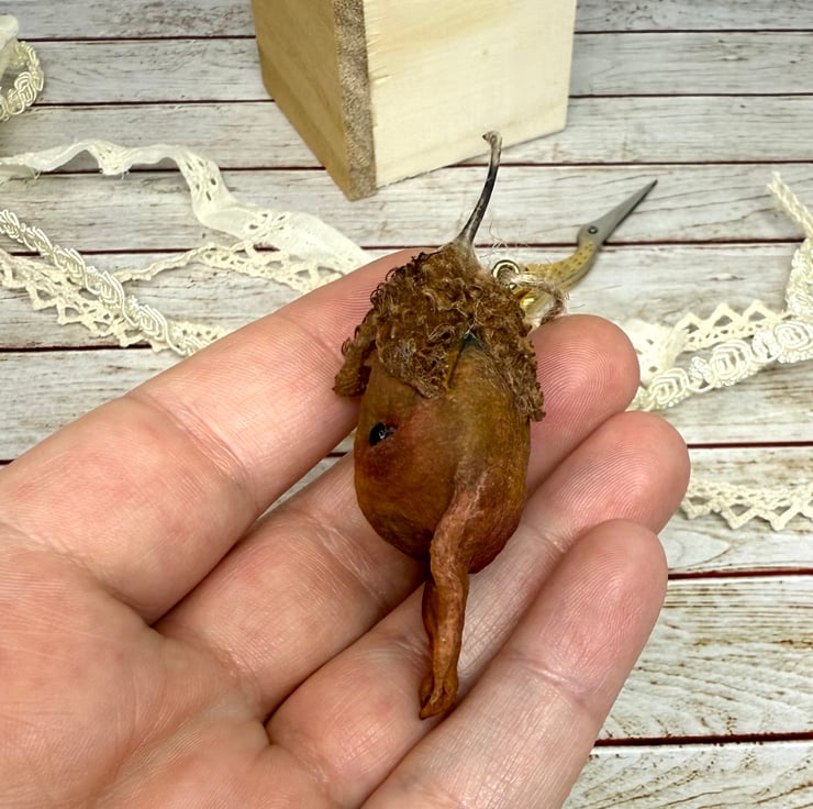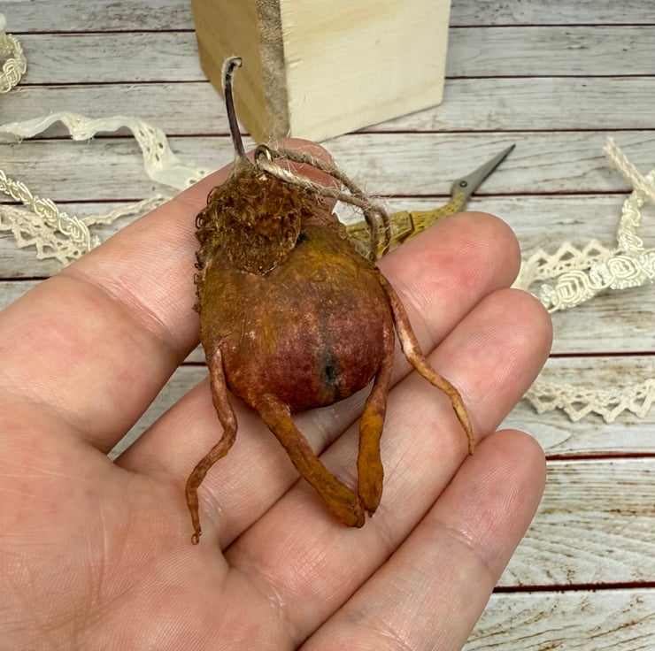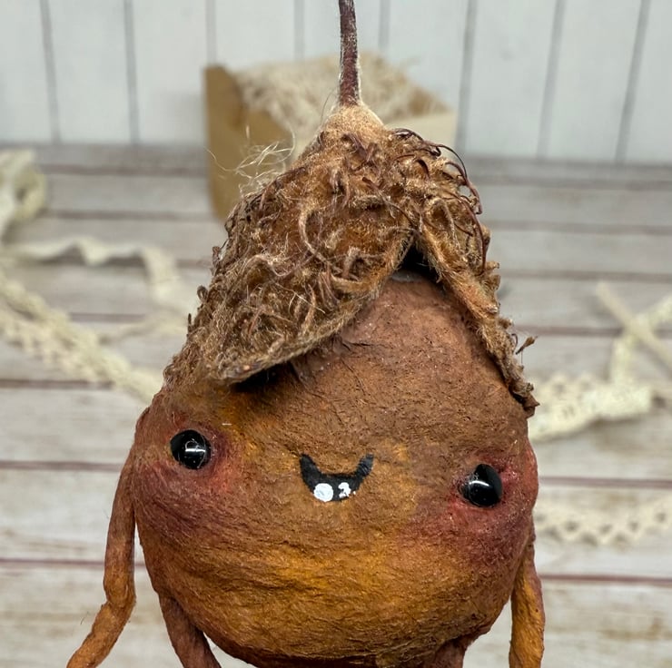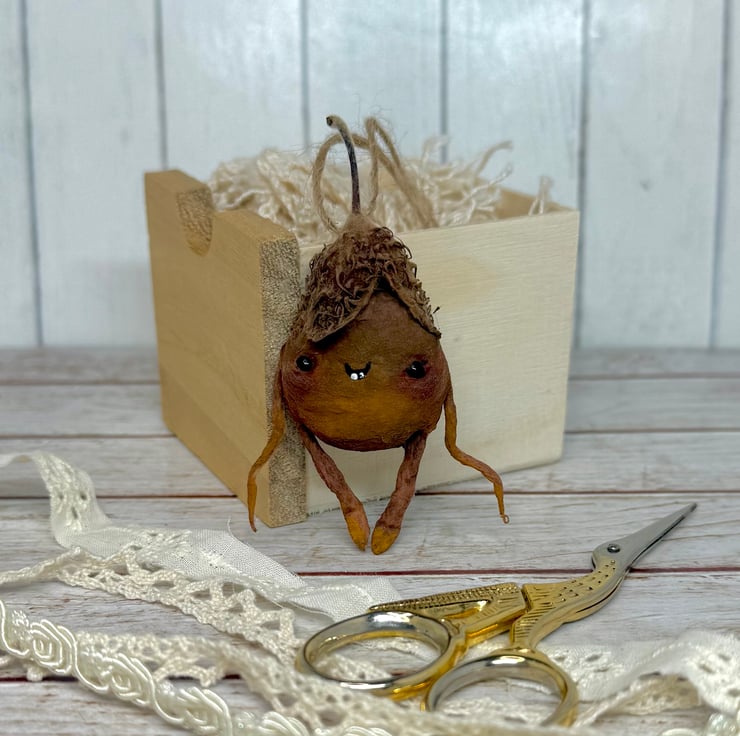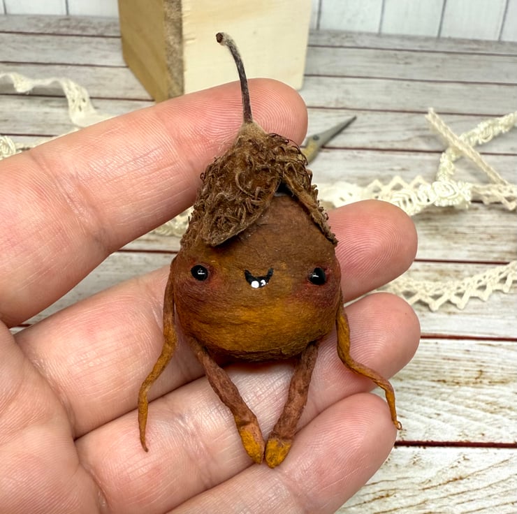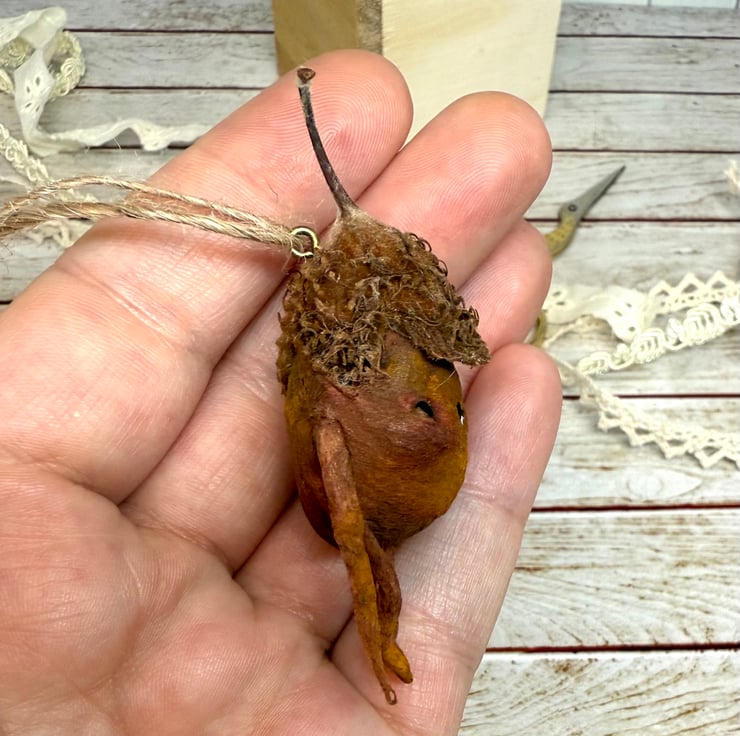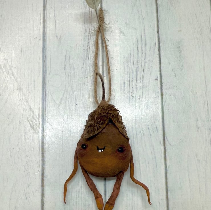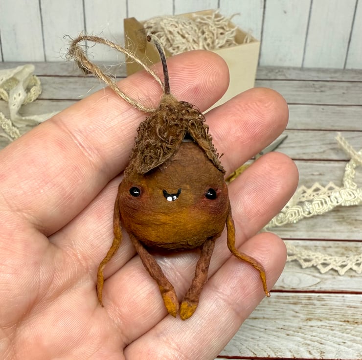 Spun Cotton character with dried beech nut hat. This little friend is hand painted with glass bead eyes and jute twine hanger. Friend measures roughly 7cm tall.