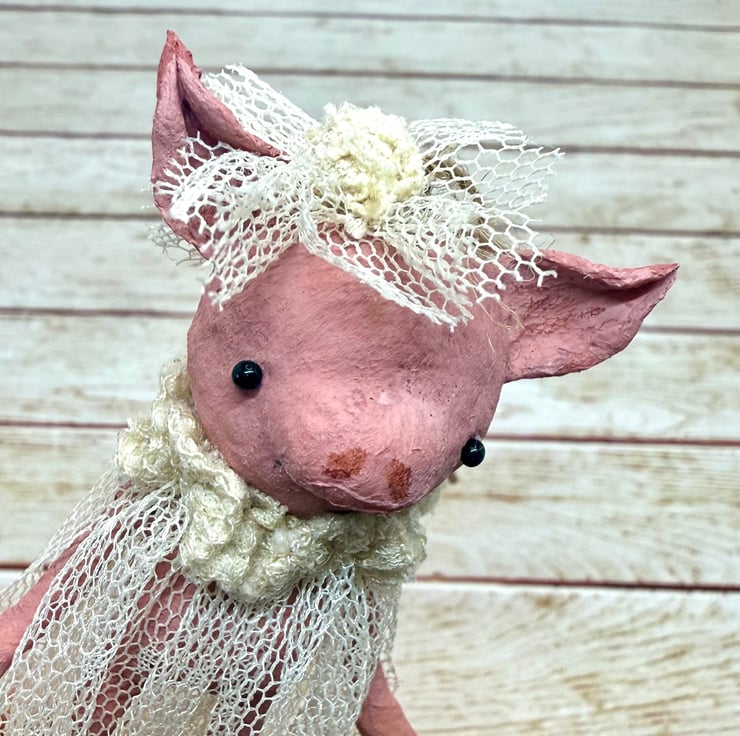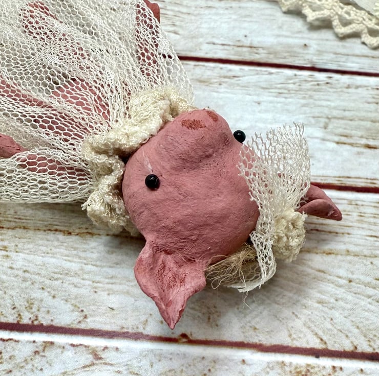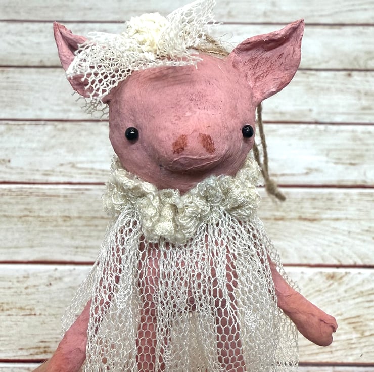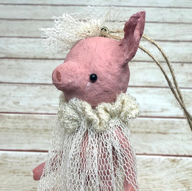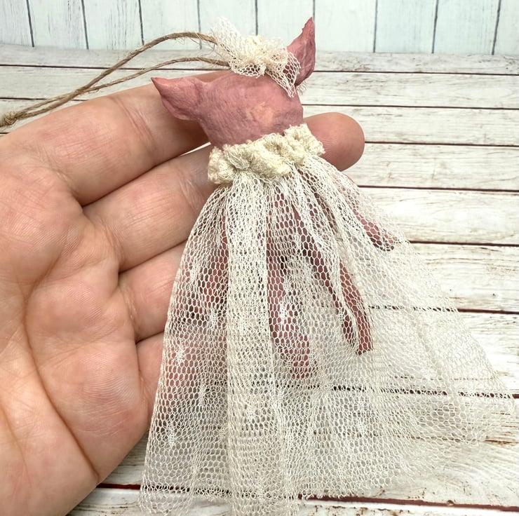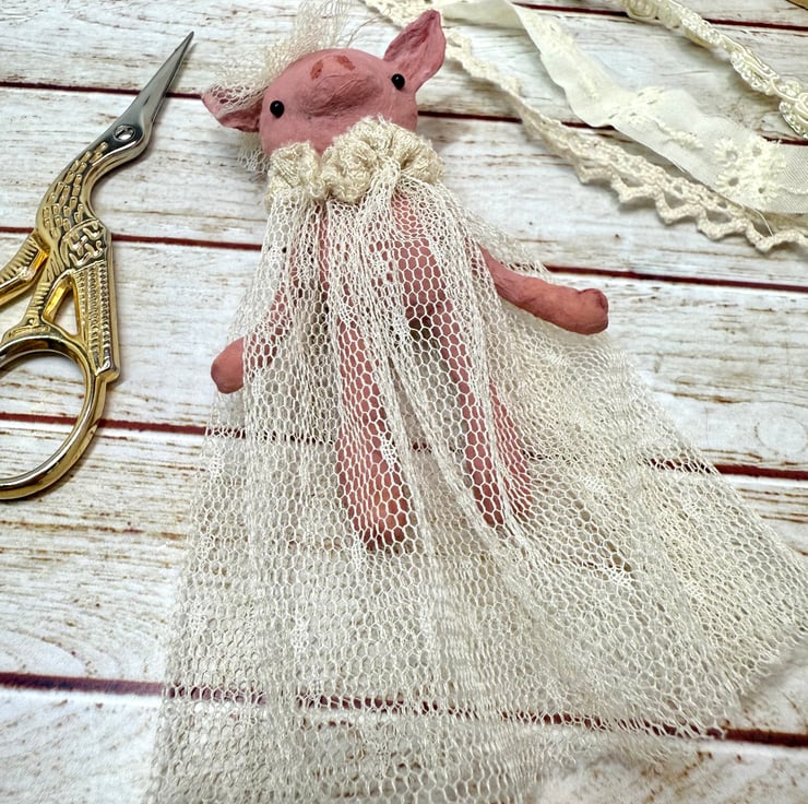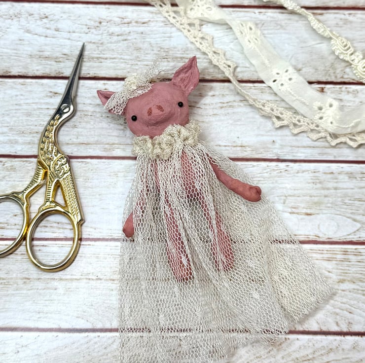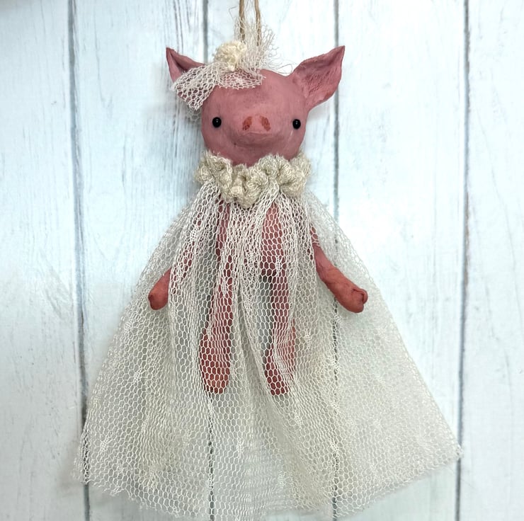 Little pink piggy art doll with glass bead eyes. Piggy wears an upcycled, hand sewn tulle dress and headpiece . Dress is extra long and a vintage cream colour. Piggy comes with jute twine hanger attached and measures roughly 8cm tall from ear to toe with the dress adding an extra 3cm . Piggy is hand painted.