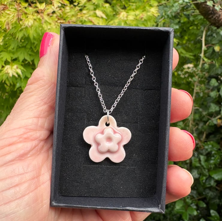 This delicate handmade porcelain flower has been glazed on both sides and is presented on an 18" Sterling Silver Belcher Chain, which has been made from 100% recycled silver.