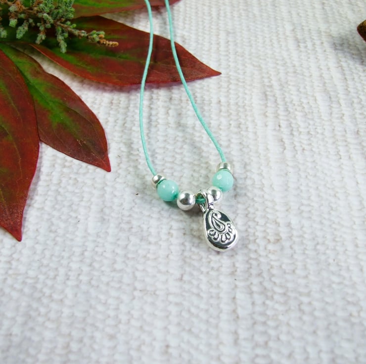 Peacock Pebble Necklace, Sterling Silver with Mint Agate on an adjustable wax cord, with sterling silver sliding clasp. Can also be worn as a wrap bracelet