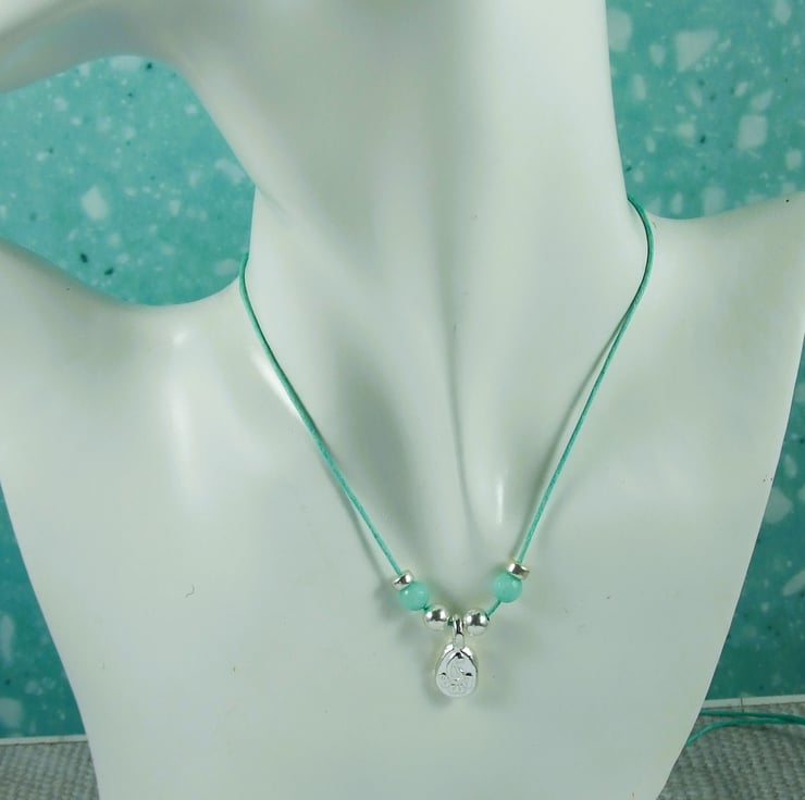 I have created the peacock pebble from molten sterling silver, heated to melting point where it forms a small pebble, then hammered it into a steel die to emboss the motif and finished with a hanging loop. This is paired with silver beads and 6mm mint agate gemstone beads. Suspended from 1mm mint waxed cord which I have fitted with a sliding silver clasp. Small silver beads have been added to the end of the cord. Necklace is put on over the head and can be worn at any length to 30 inches or wrapped around your wrist to wear as a bracelet.