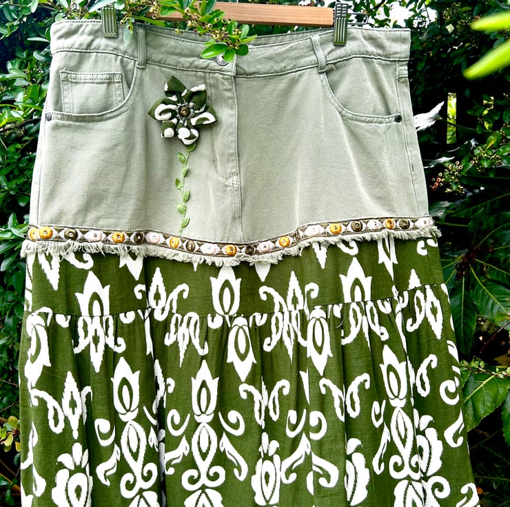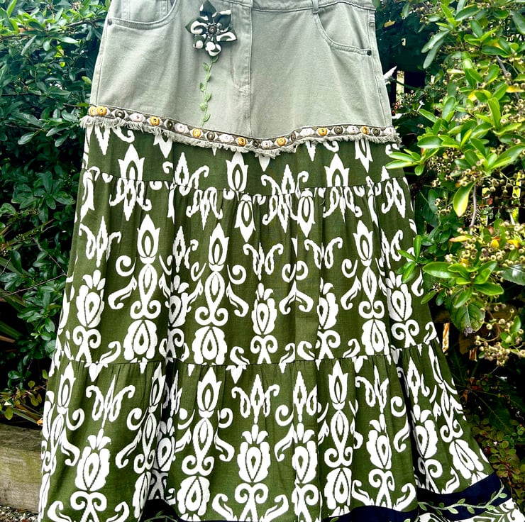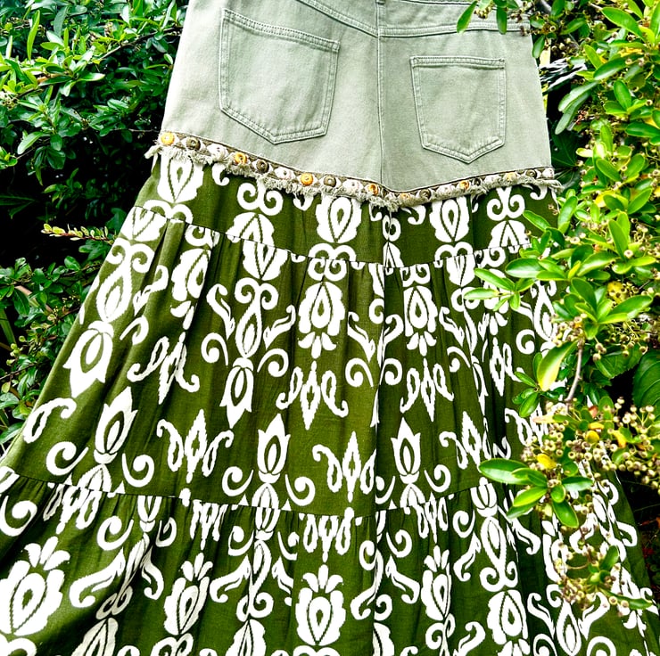 The top section is a green cotton denim and the bottom section is a floaty printed cotton.