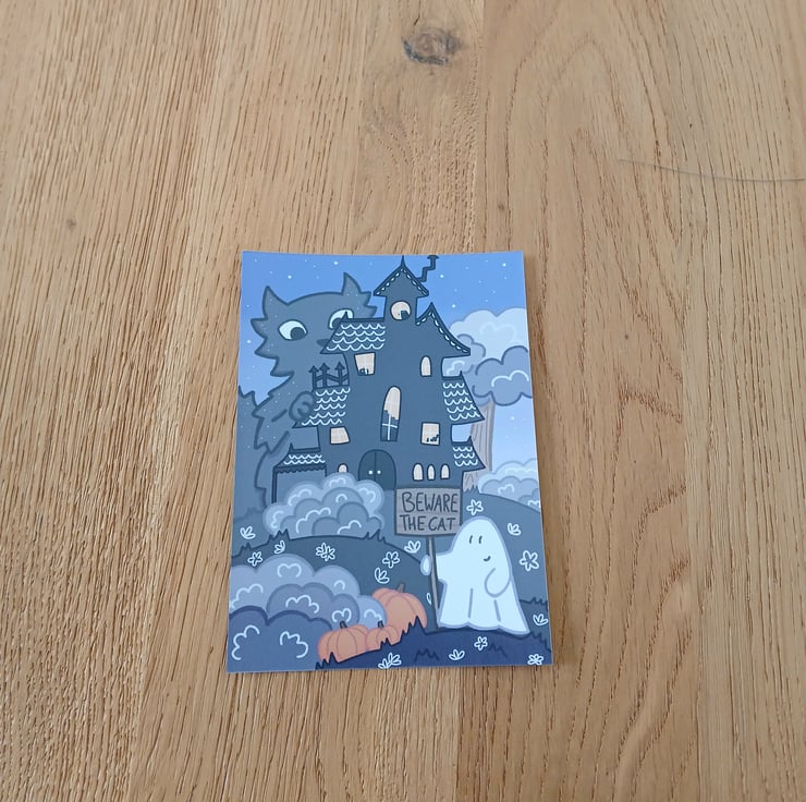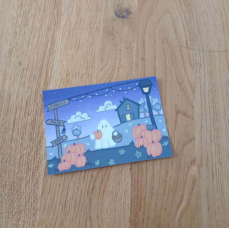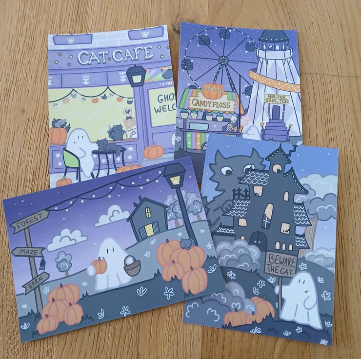 One cute ghost is on quite the roadtrip this Halloween! Catch him at the funfair, the pumpkin patch, the haunted house or the cat cafe, posing for a quick holiday snap before he heads for the next location. Each postcard has been digitally hand drawn by me, and has a space on the back for a stamp (and barcode), address, and a message.
