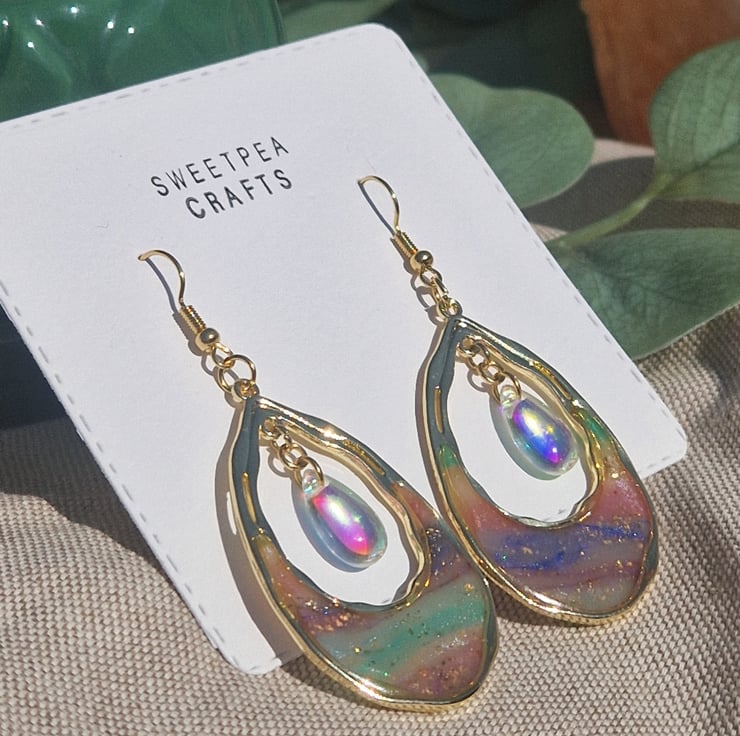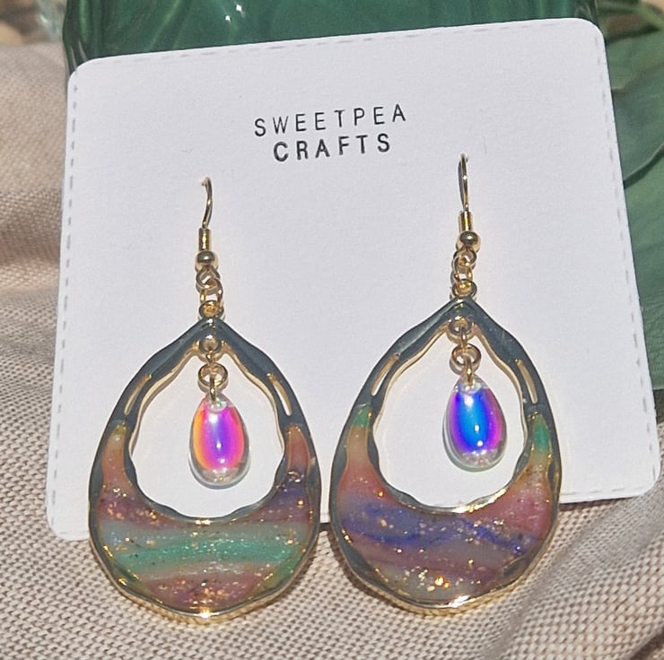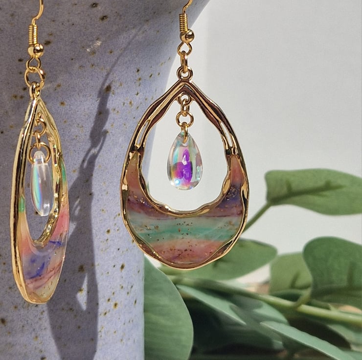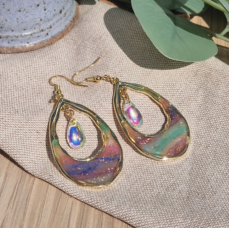 Handmade with care, these bezel teardrop earrings are crafted from lightweight polymer clay, making them comfortable enough to wear all day. Each pair is unique, no two are exactly the same, giving you a truly one-of-a-kind accessory. Approximately 75mm long. Hypoallergenic hooks.